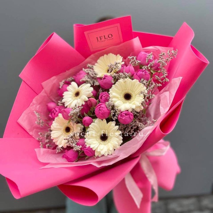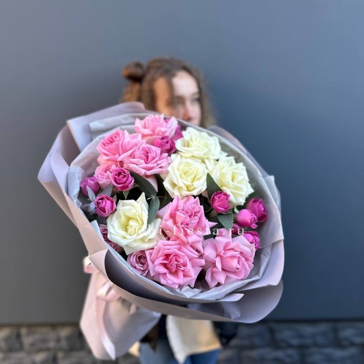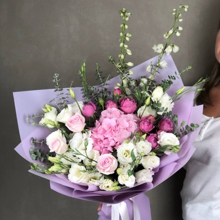 Цветочная корзина из пионов и пионовидных роз "Юниверсити"
