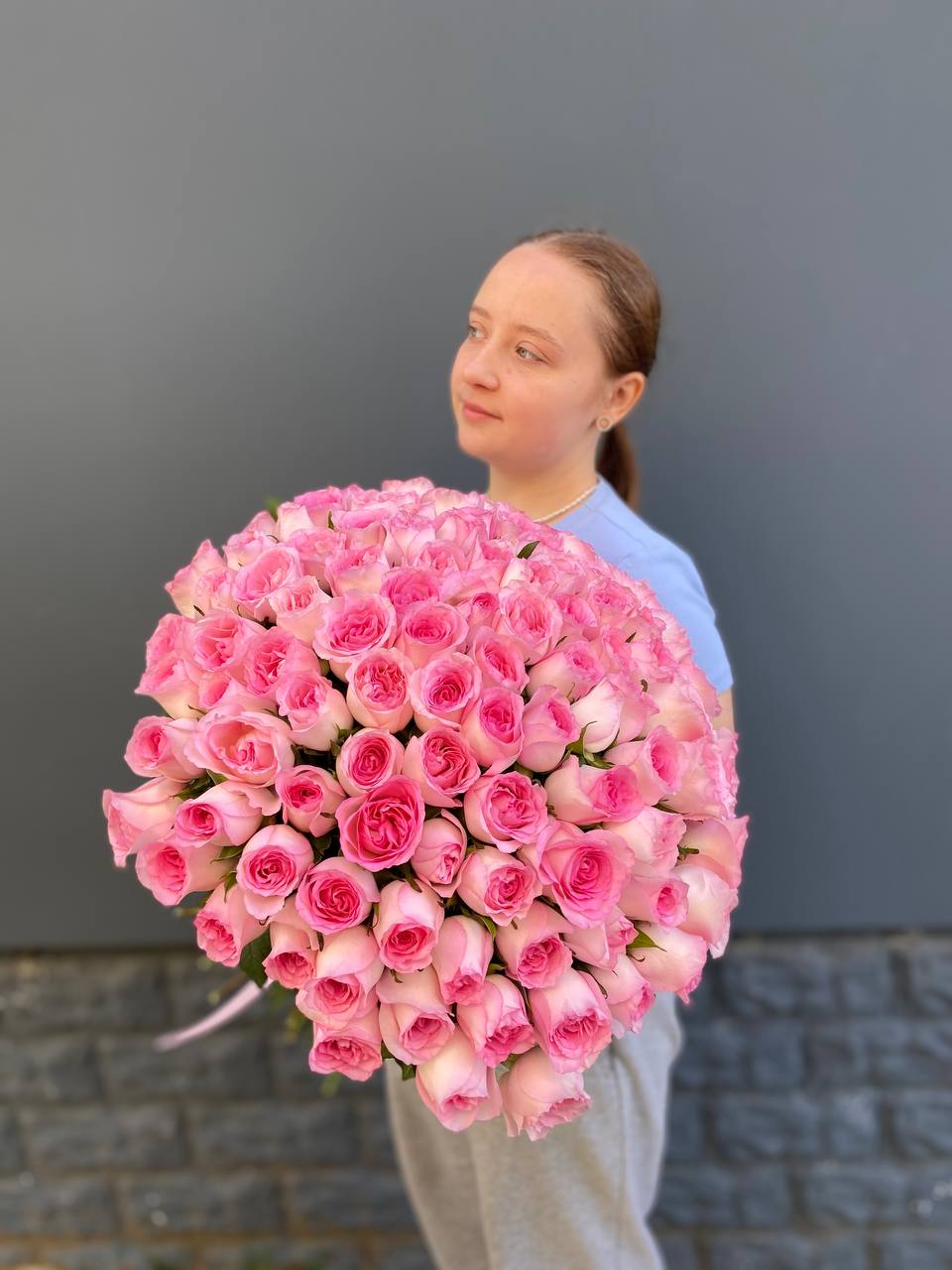 Сто один бутон кенийского пионовидного сорта собраны в масштабную композицию. Белая окантовка лепестков переходит в розовый центр. Впечатляющее присутствие в любом пространстве.