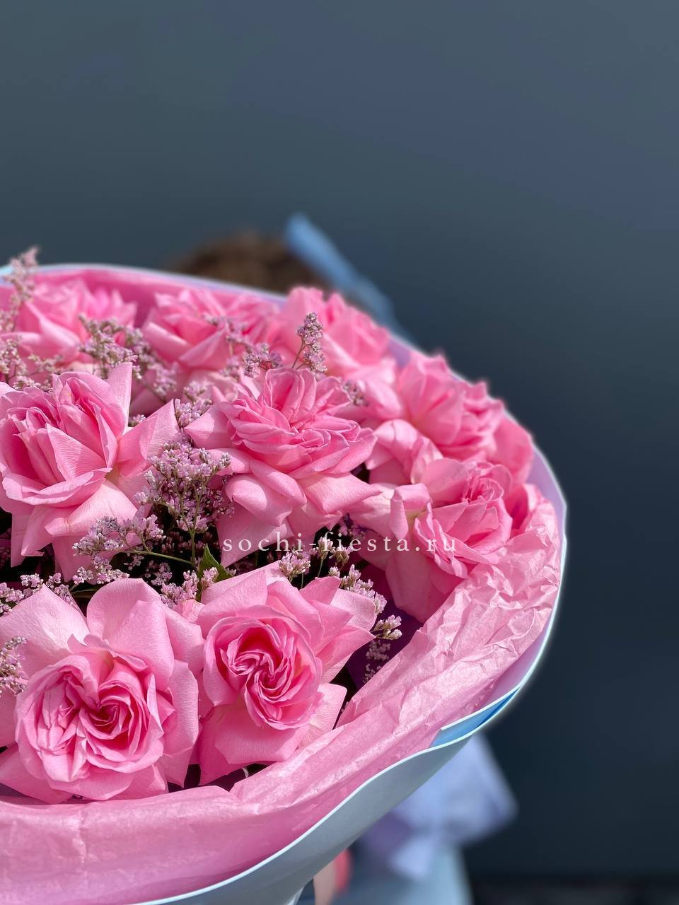 Французские розы распускаются мягкими облаками пудрового оттенка. Лимониум добавляет воздушности, а эвкалипт создает свежую основу. Букет собран так, что каждый бутон виден и дышит.
