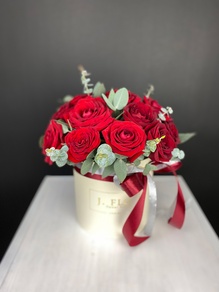 Пятнадцать вывернутых роз Джумилия раскрывают свою многослойную структуру в каждом бутоне. Эвкалипт обрамляет композицию, подчёркивая фактуру лепестков.