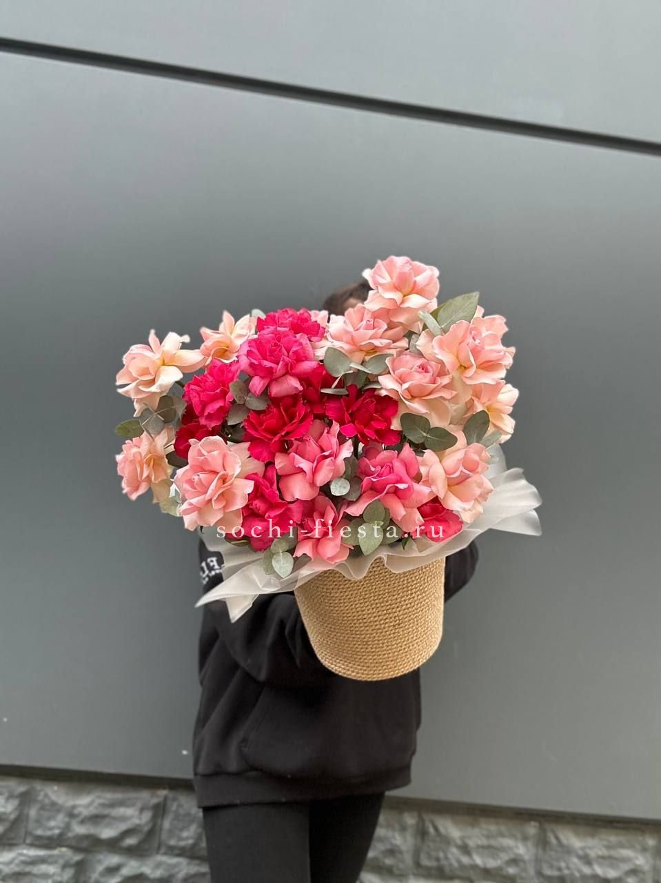 вывернутые  розы, джутовое кашпо.