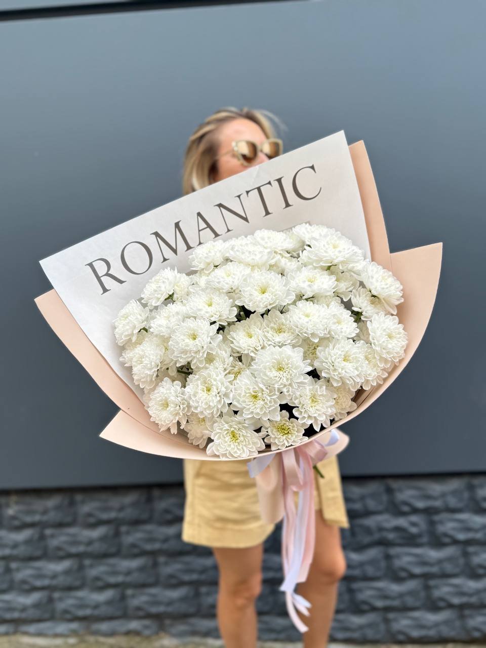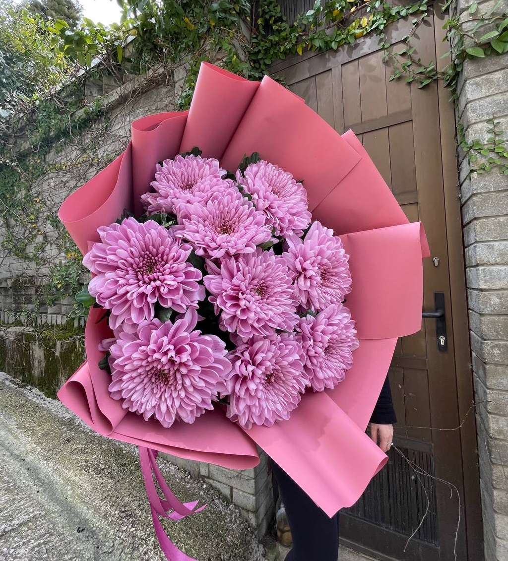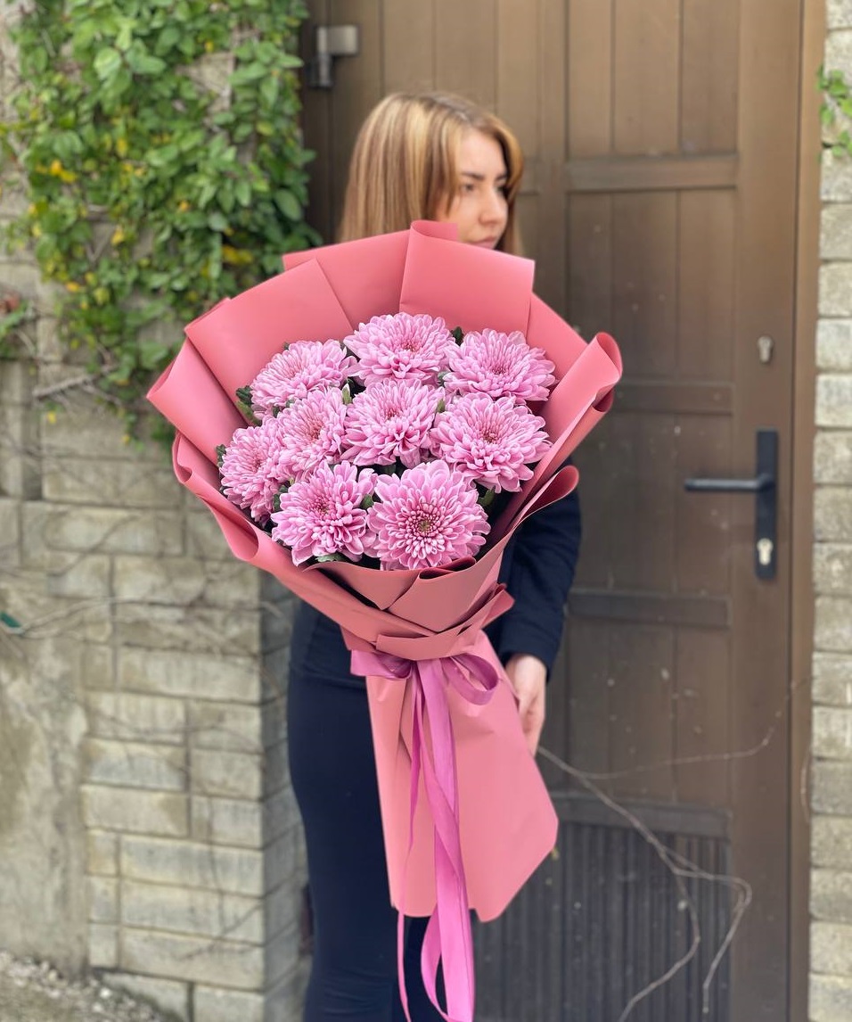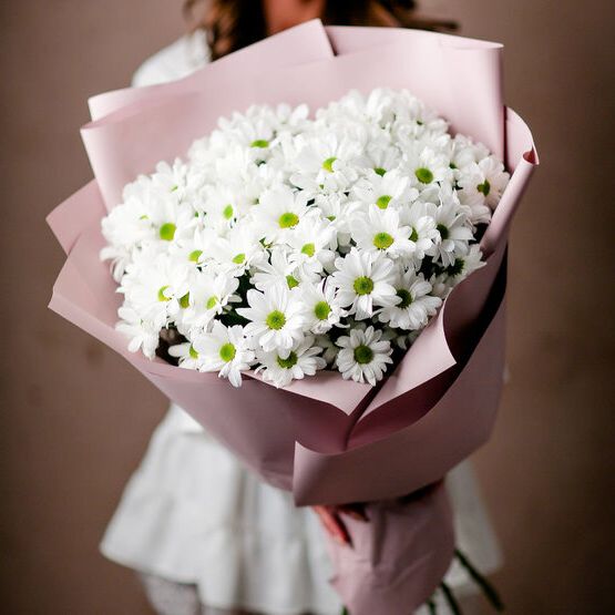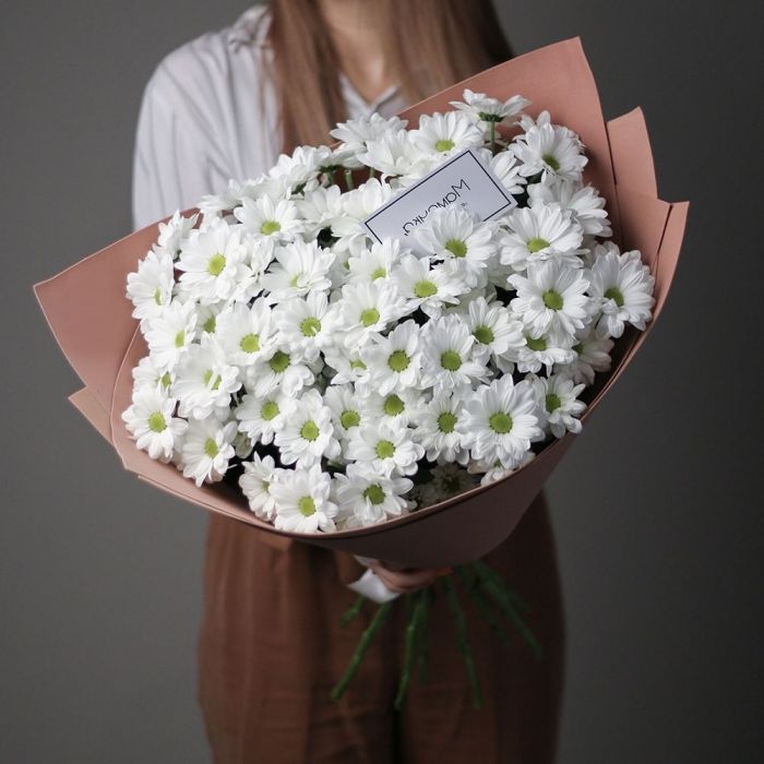 Пять кустовых хризантем собраны в лаконичный букет с мягким обрамлением. Пышные соцветия создают воздушный объем и заполняют пространство легкостью.