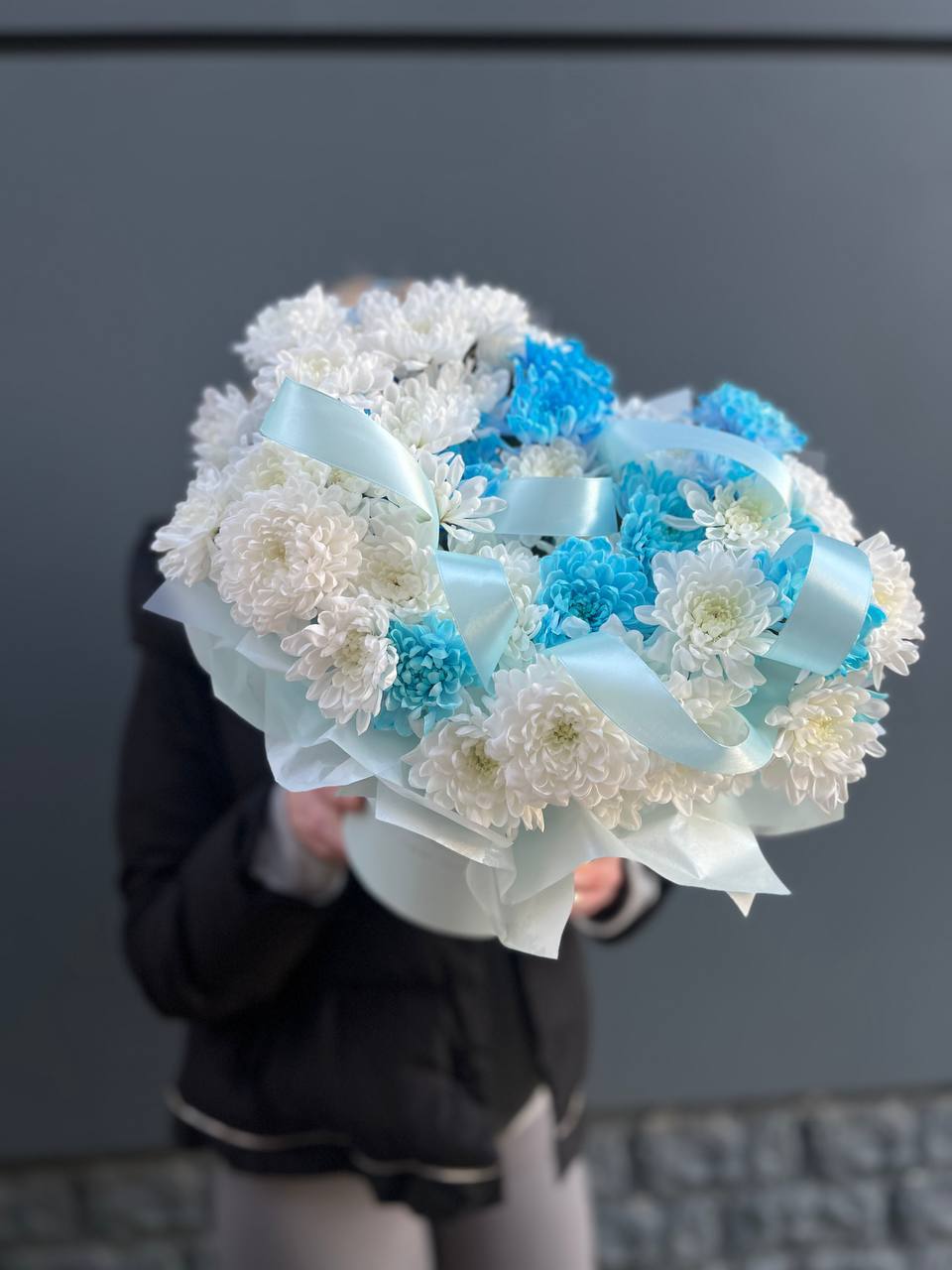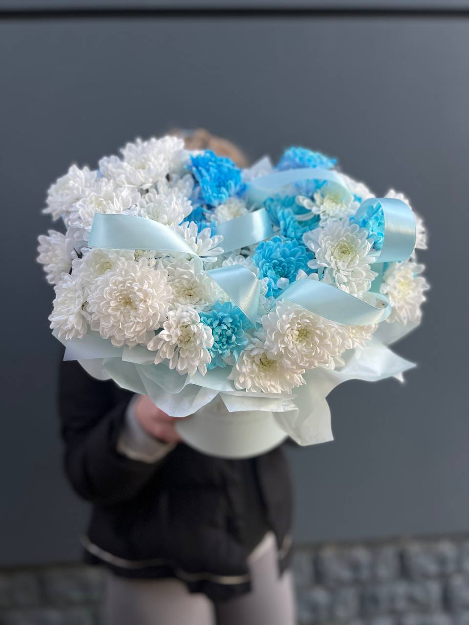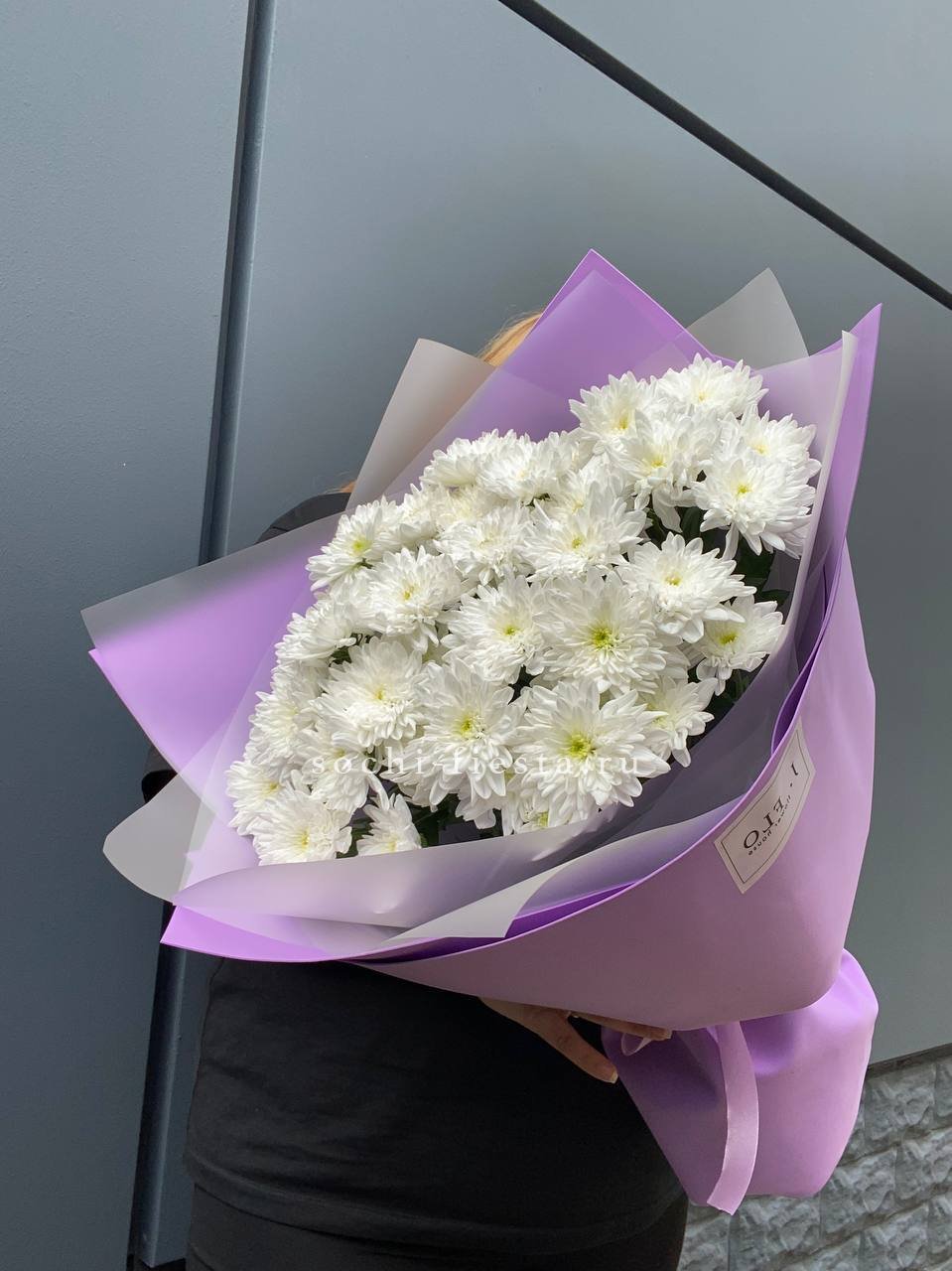 Пять кустовых хризантем собраны в лаконичный букет с мягким обрамлением. Пышные соцветия создают воздушный объем и заполняют пространство легкостью.