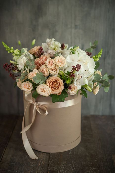 Настоящий цветочный фейерверк в стильной коробке! Эта пышная и многосоставная композиция притягивает взгляды богатством форм и оттенков — от кремового и персикового до насыщенного розового и белого. Это не просто цветы, а целая история о радости, празднике и восхищении. Подарок, который гарантированно произведет яркое впечатление и останется в памяти надолго.