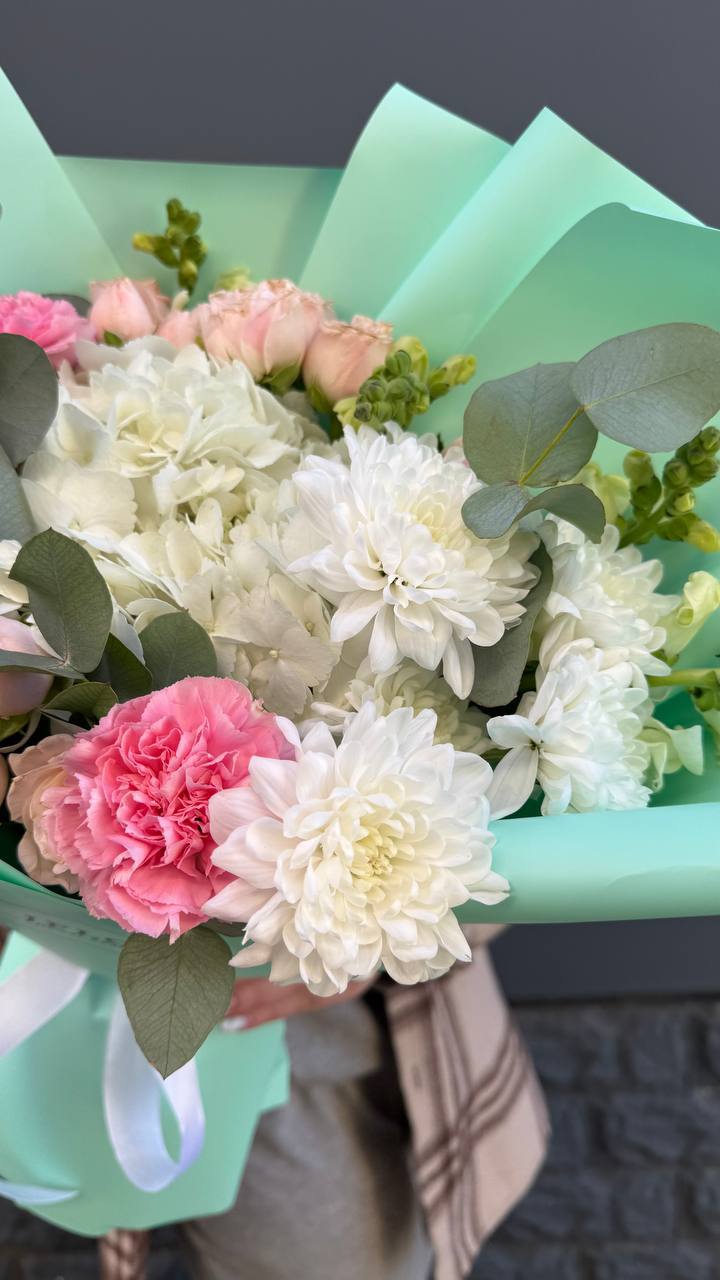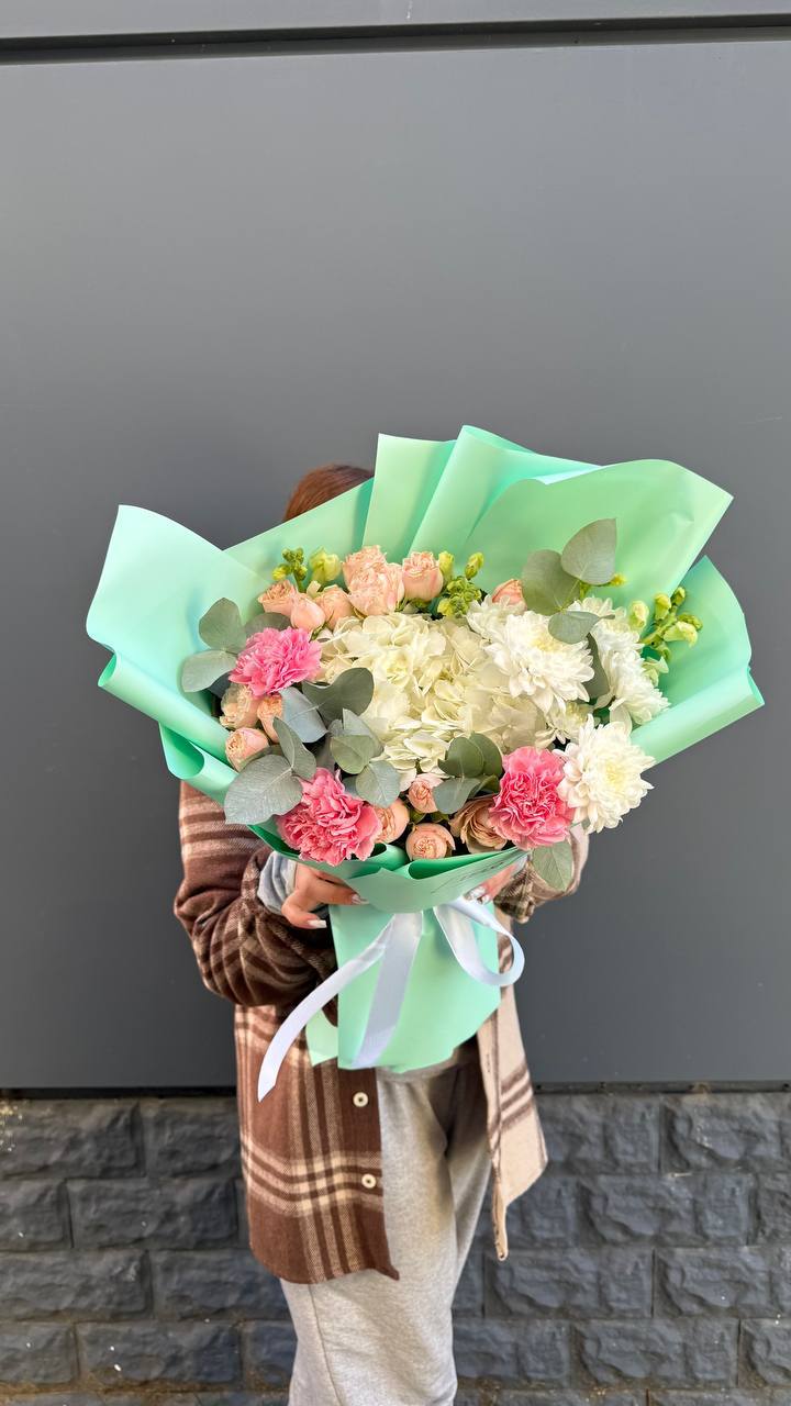 гортензия, хлопок, бомбастик, белая роза, маттиола- может меняться от сезона на диантус, ковыль, упаковка.