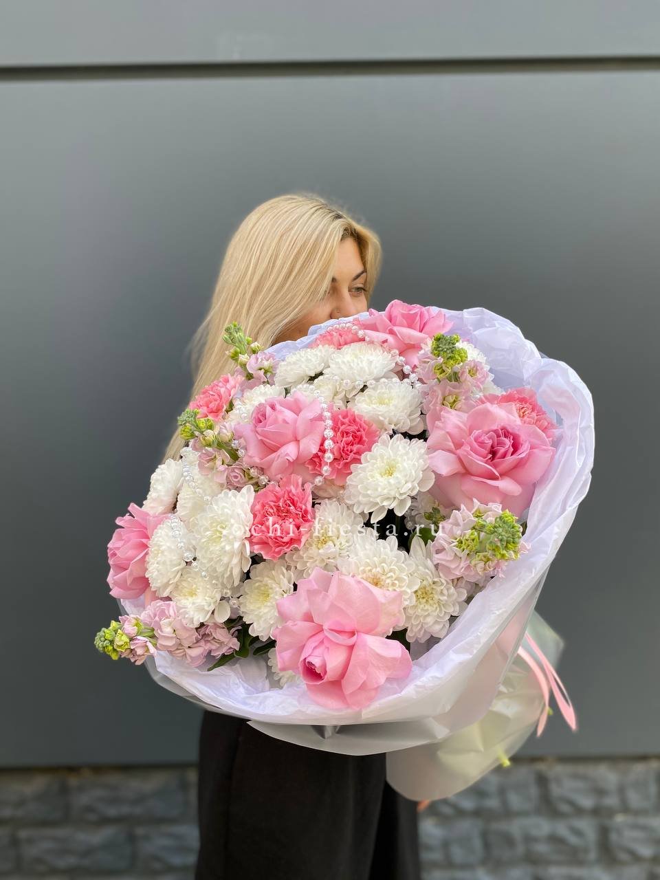 хризантема, маттиола, диантусы, розы с элементами бусин в воздушном оформлении.