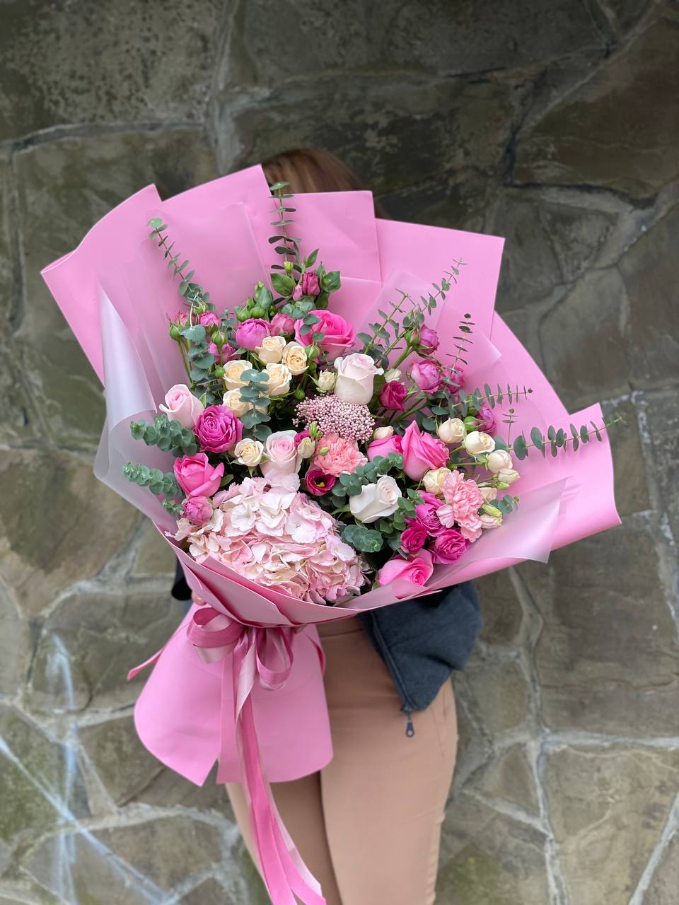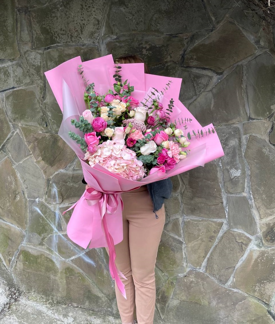 Воздушные кисти мисти бабблс переплетаются с яркими диантусами создавая объёмную текстуру. Эвкалипт добавляет свежести и завершает композицию лёгкими зелёными нотами.