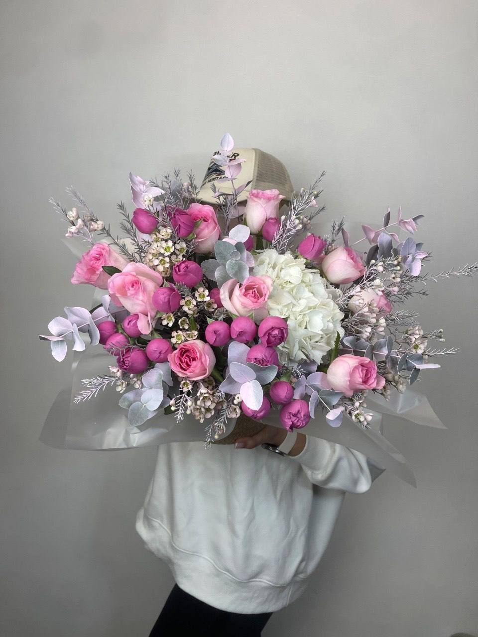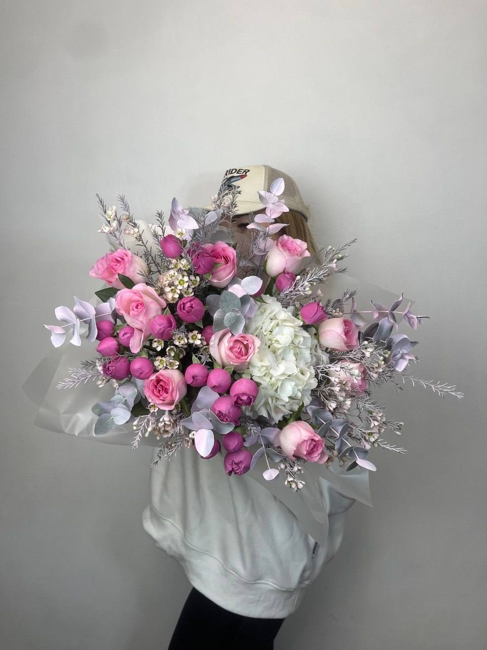 диантусы, эустома, красные розы, эвкалипт, пленка.