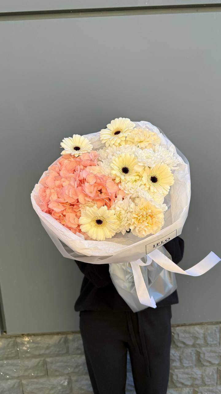 Сочетание воздушной гортензии и классических гербер в одном букете. Этот микс — идеальный баланс между нежностью и стилем. Тот самый подарок, который мгновенно преображает пространство и дарит ощущение праздника. Идеальный выбор для тех, кто вдохновляет на самое лучшее.