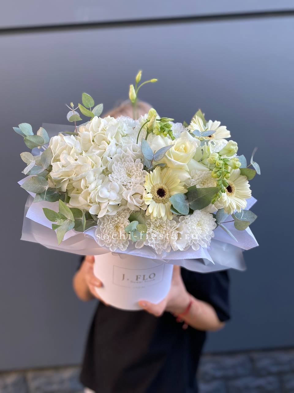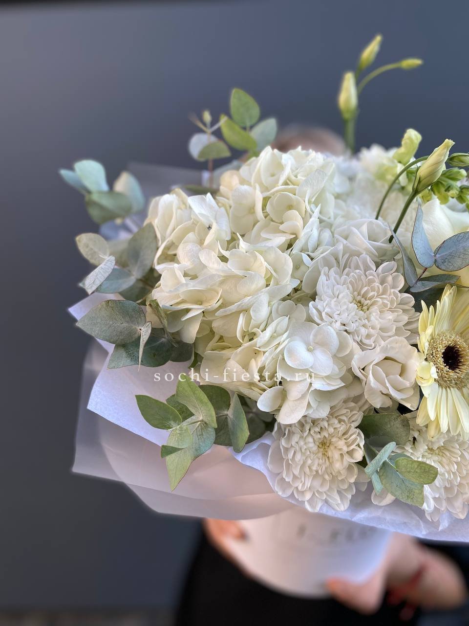 Розы и гортензия формируют объемную текстуру, где каждый бутон раскрыт по-своему. Эустома заполняет пространство между крупными соцветиями, а эвкалипт обрамляет композицию мягкой зеленой волной.