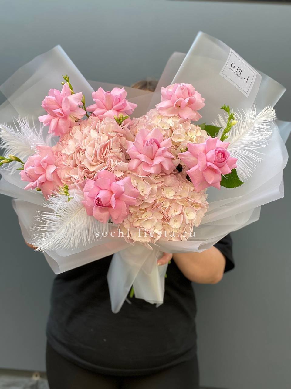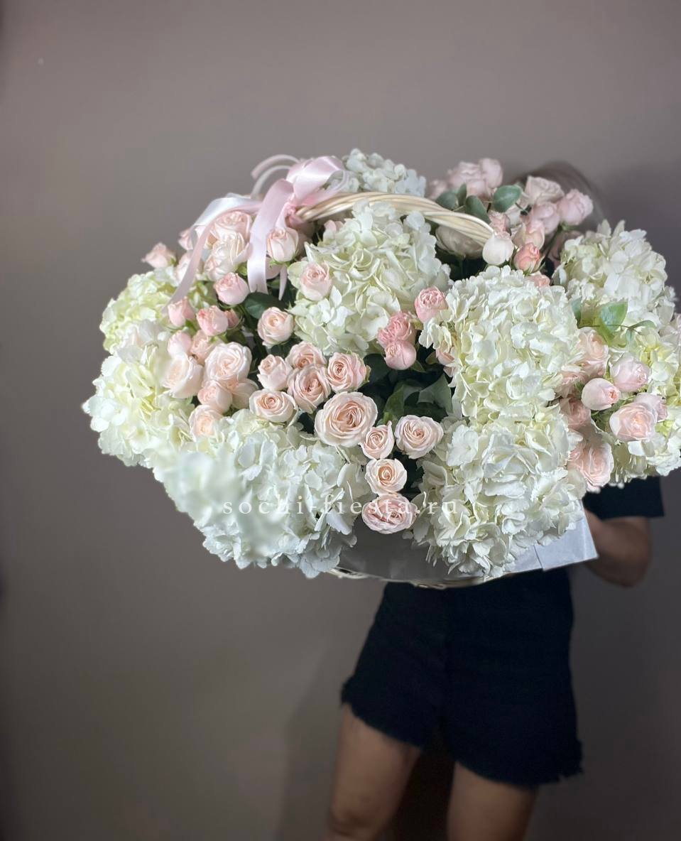 гортензия, герберы, белые розы, эустома,  лента и дизайнерская пленка.