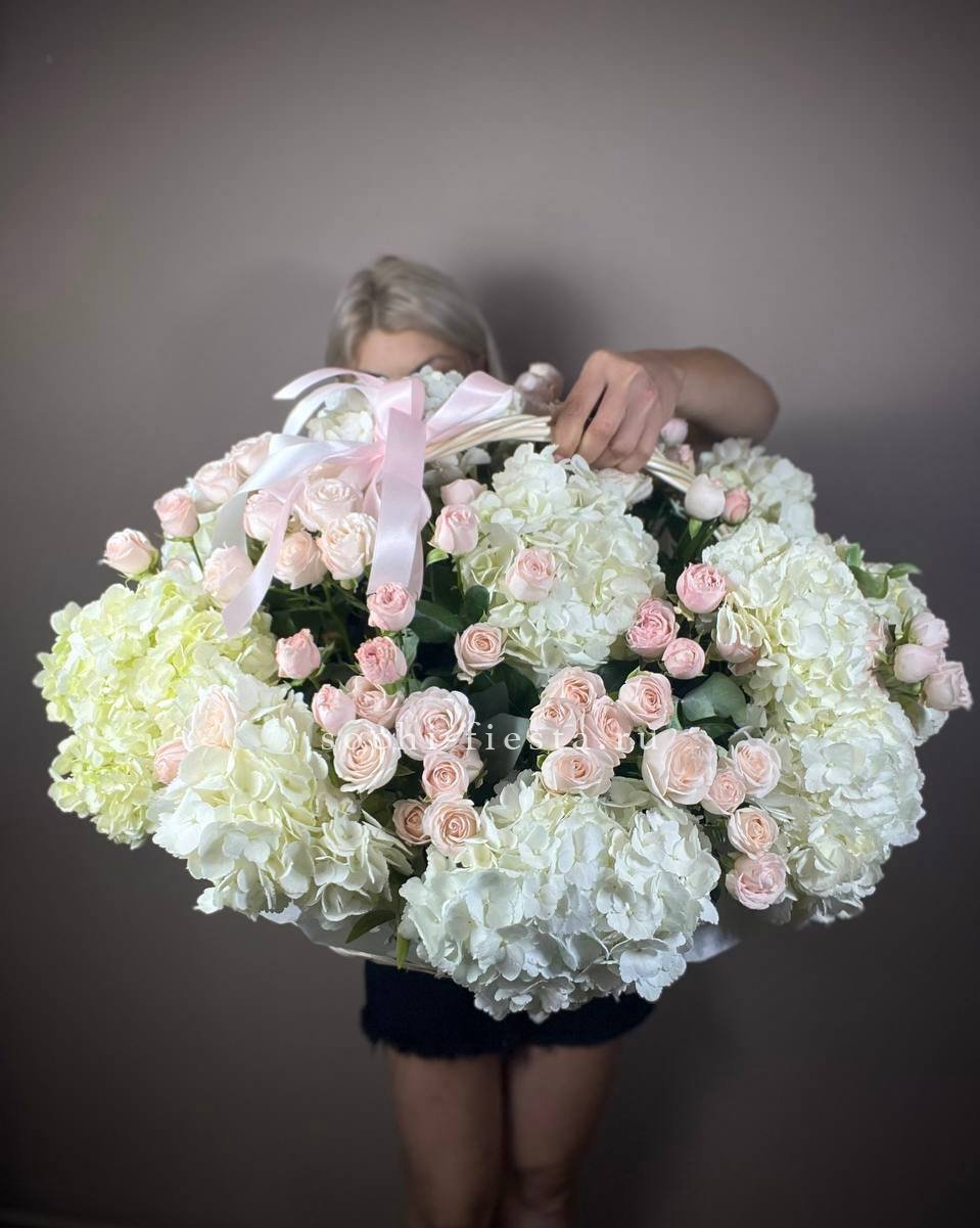 Белые розы, герберы и соцветия гортензии образуют плотную композицию с чёткими линиями. Эустома добавляет воздуха между крупными бутонами, а дизайнерская упаковка завершает форму.