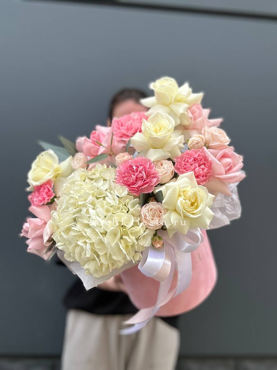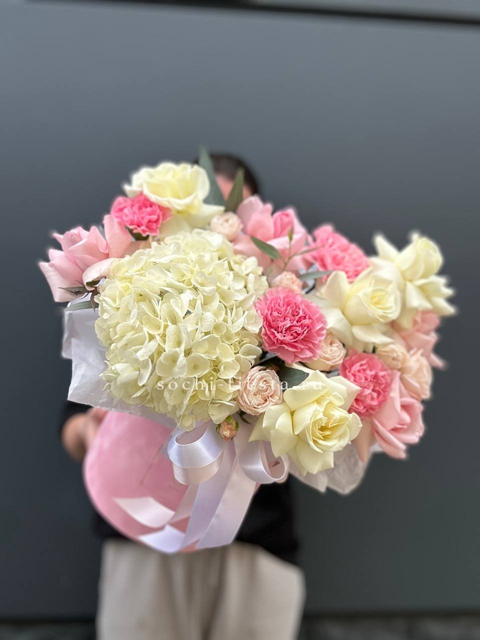 Гортензия создаёт воздушную базу, а герберы добавляют яркие точки цвета. Эвкалипт заполняет пространство между бутонами и придаёт композиции завершённость. Букет выглядит свежо и легко.