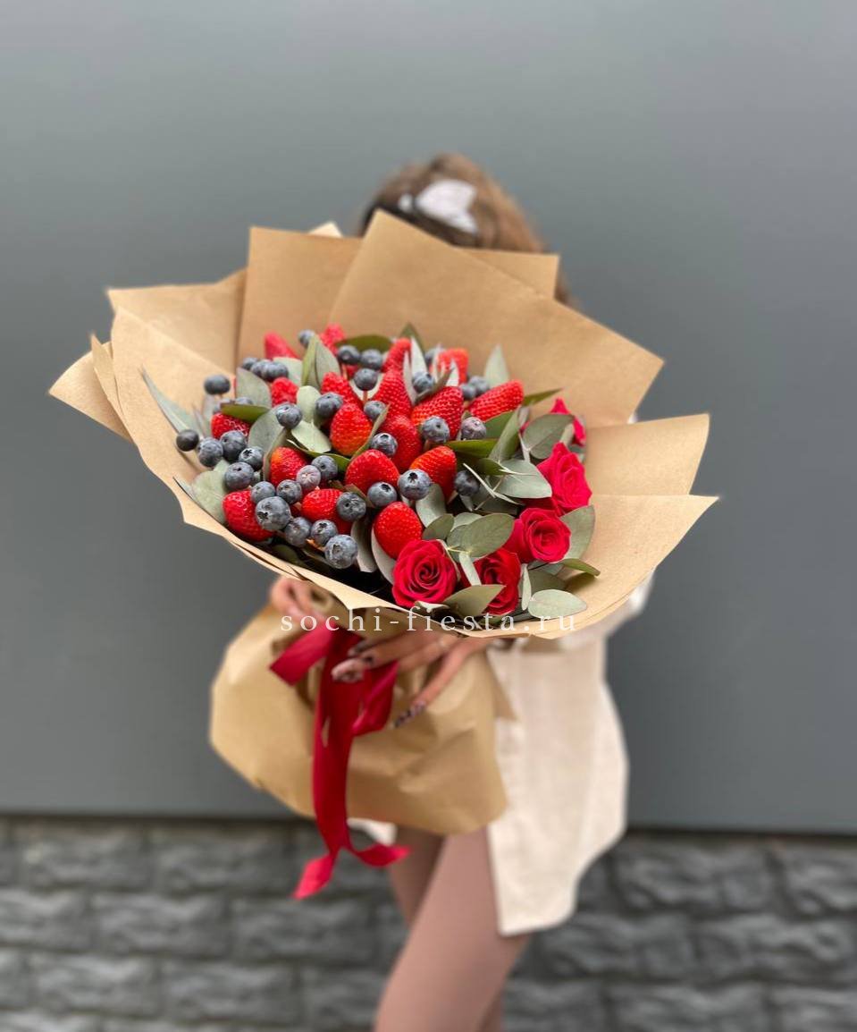 Пять алых роз соседствуют со свежей клубникой и россыпью голубики в естественной крафтовой обёртке. Зелень фисташки добавляет композиции лёгкости и воздуха. Сезонное сочетание цветов и ягод в одном букете.