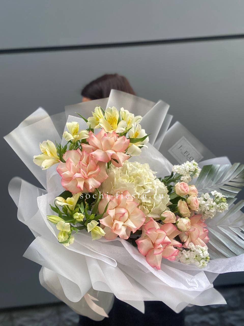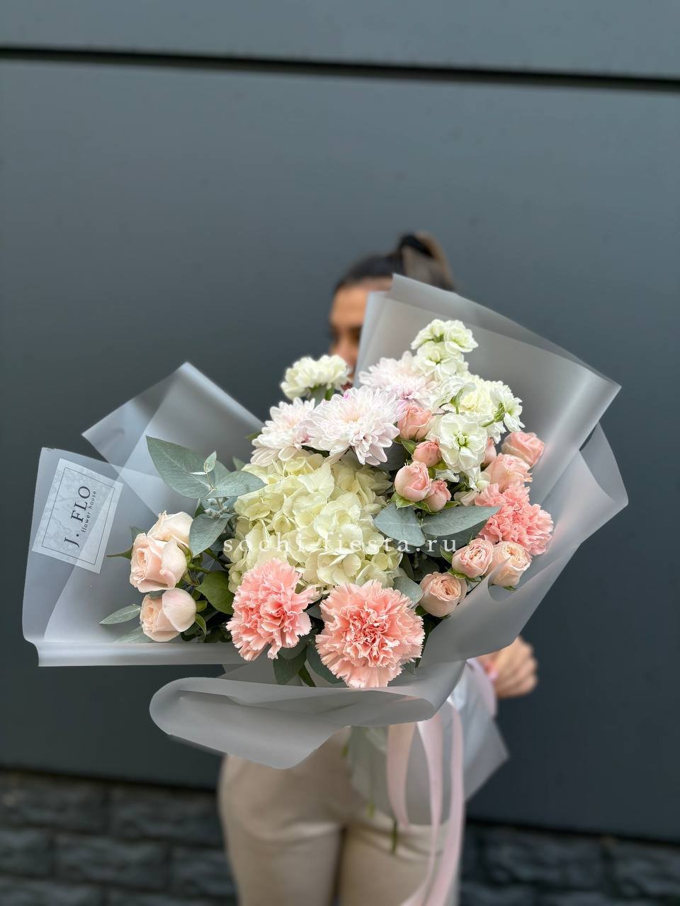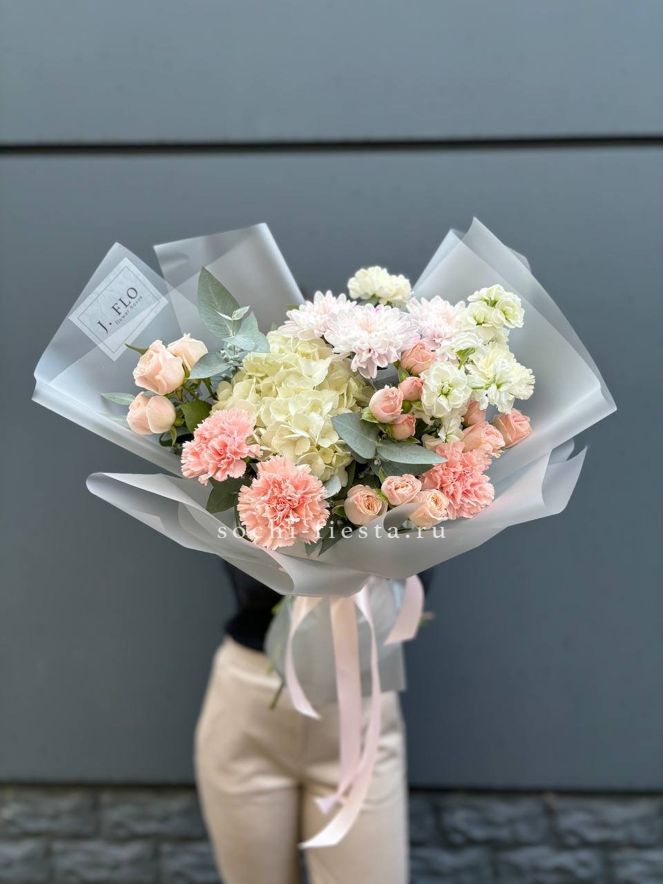 Крупные соцветия гортензии задают основной объем, а эустома и диантус разбивают плотность воздушными бутонами. Мисти баблс и озотамус рассыпаются между цветами, добавляя движение и легкость всей композиции.