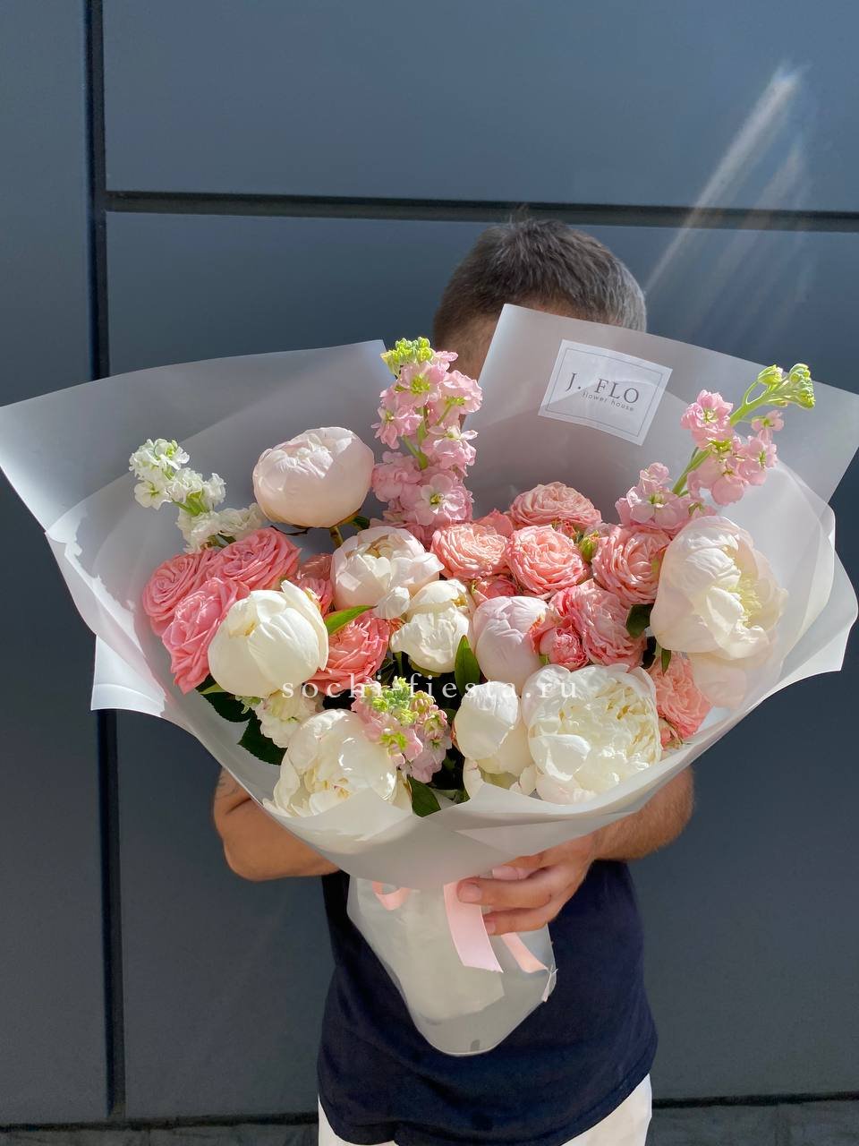 пионы, роза пионовидная, маттиола, лента, дизайнерская пленка.