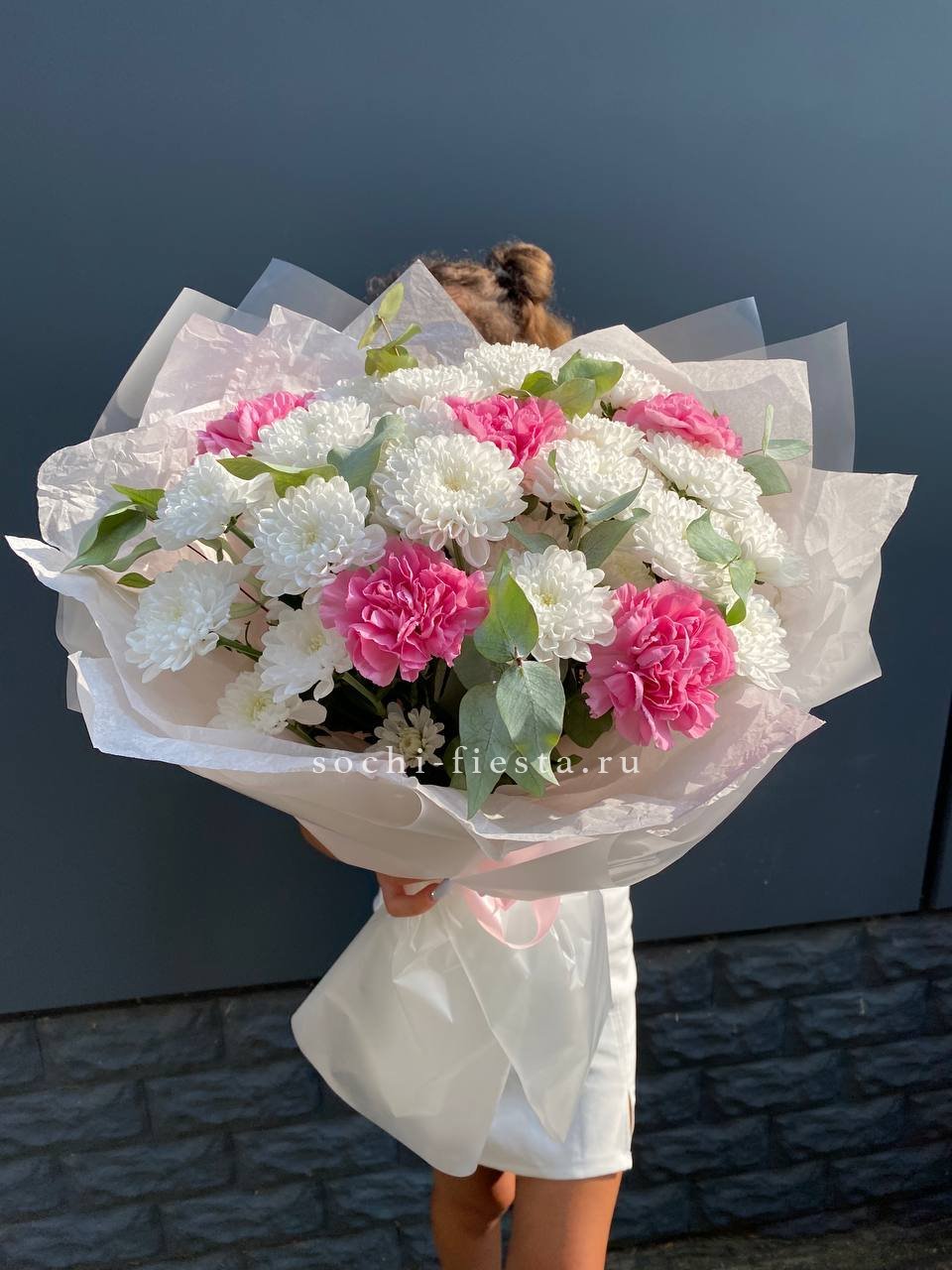 Воздушные соцветия кустовой хризантемы чередуются с яркими головками диантусов. Эвкалипт обрамляет букет серебристой зеленью, создавая лёгкое и свободное настроение.