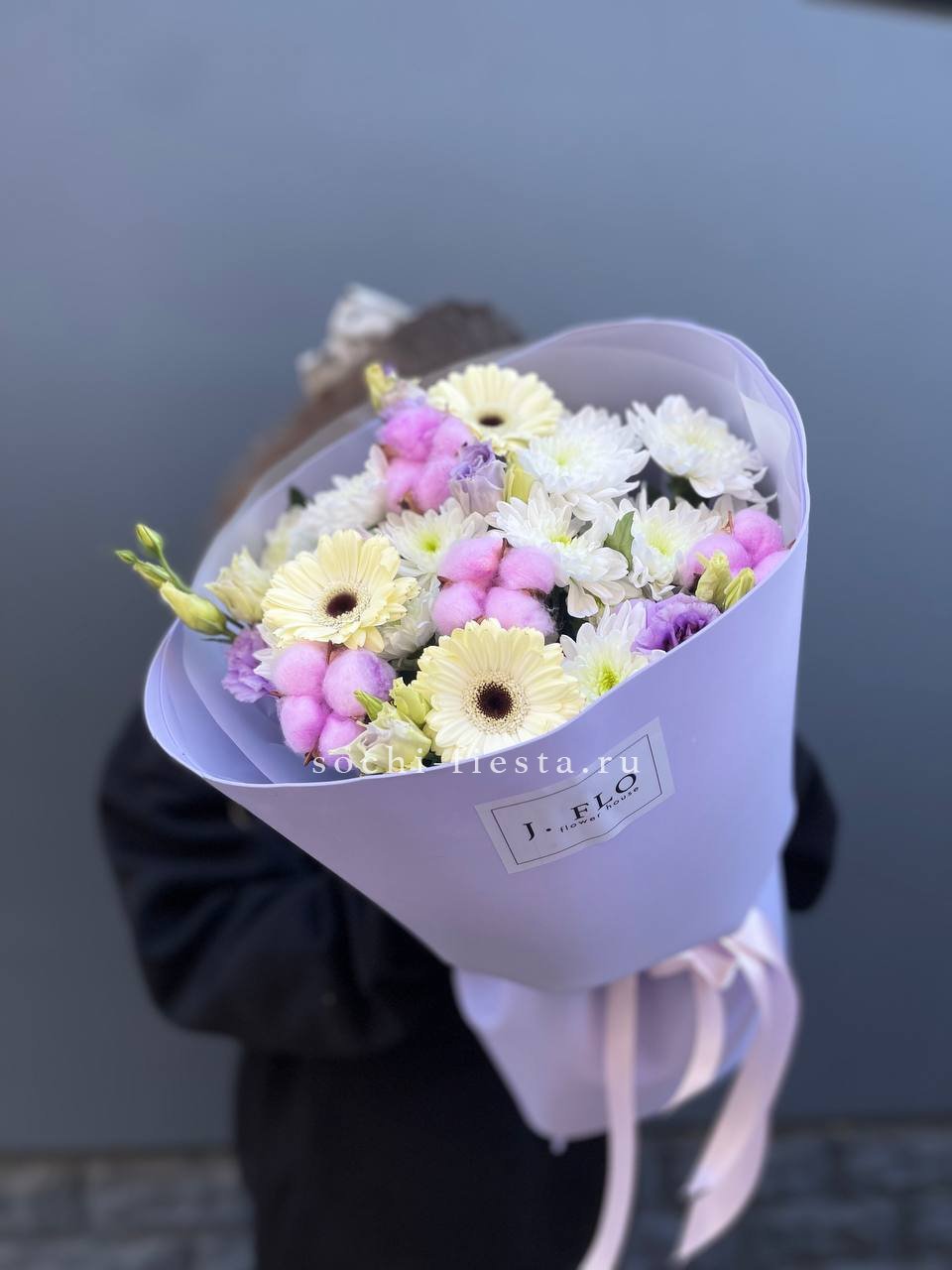 гортензия, хризантема, хамелациум, гербера, мисти баблс, диантус, пленка.