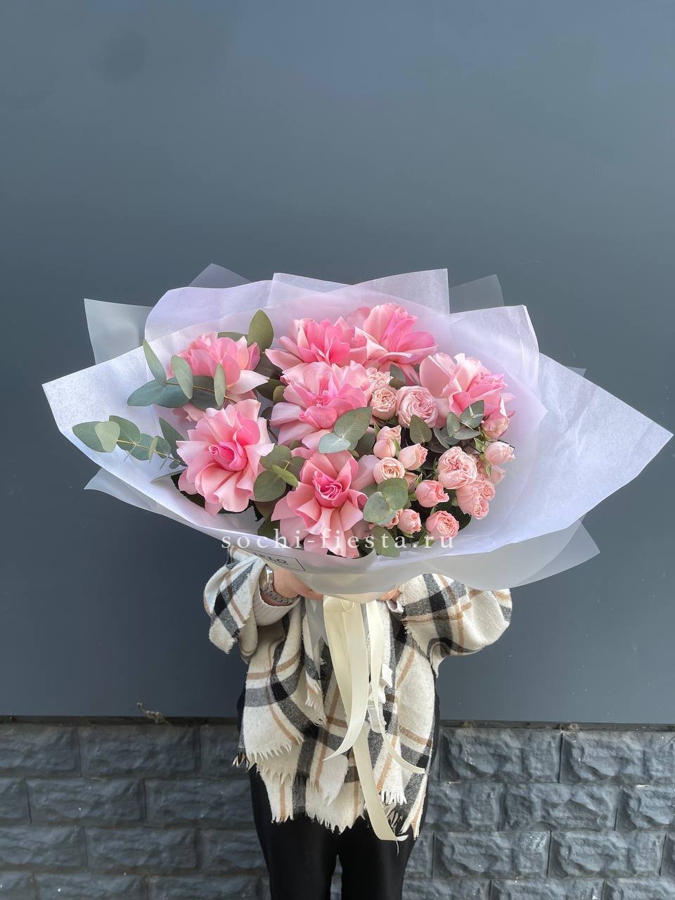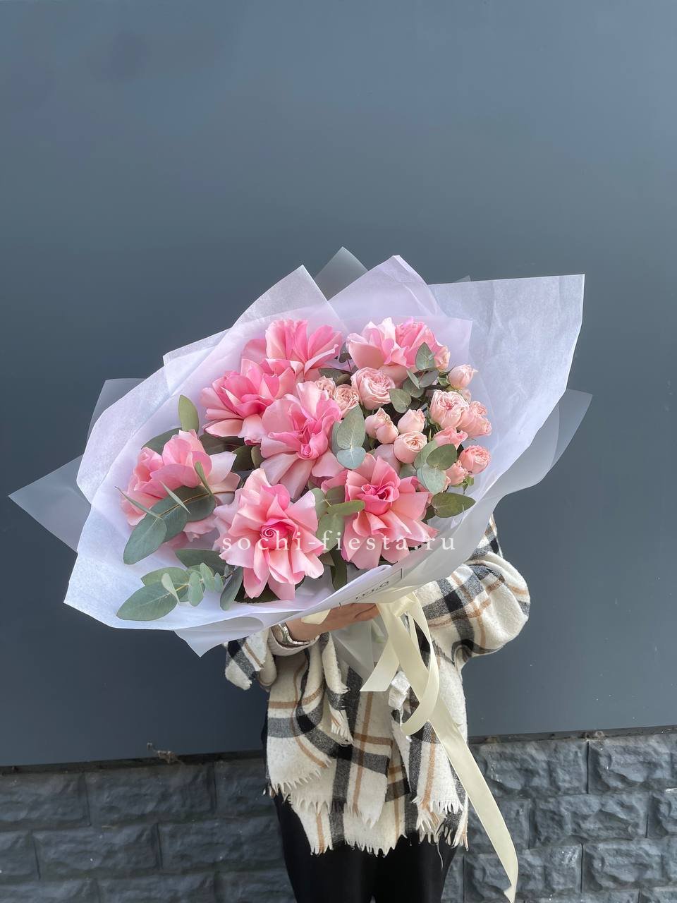 Розовые розы и диантусы окружены пышными соцветиями маттиолы и бомбастика. Композиция собрана плотно, каждый цветок поддерживает соседний, создавая объемную округлую форму. Букет держит силуэт и выглядит цельно с любого ракурса.