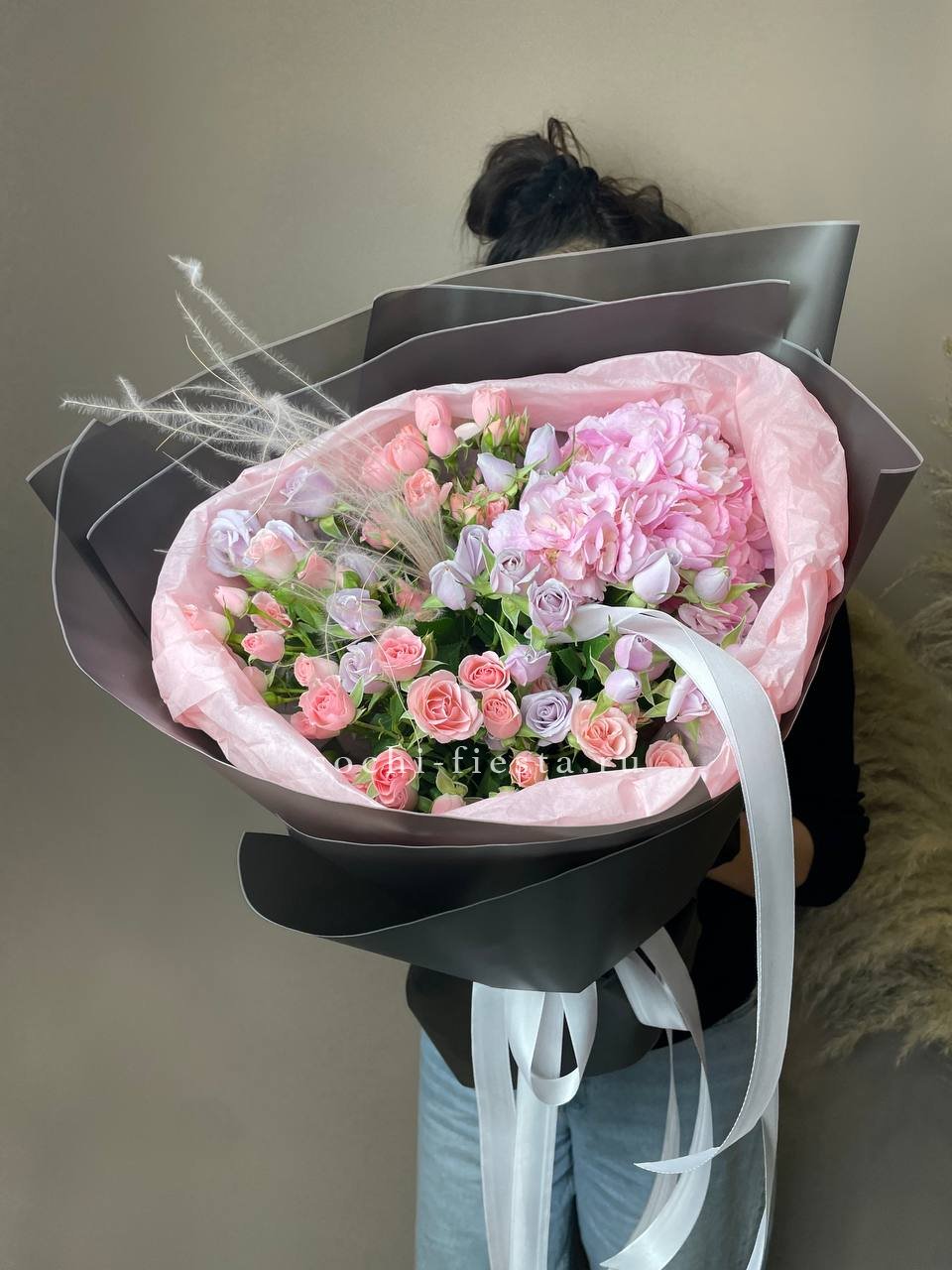 кустовые розы, эустомы, лента и дизайнерская пленка.