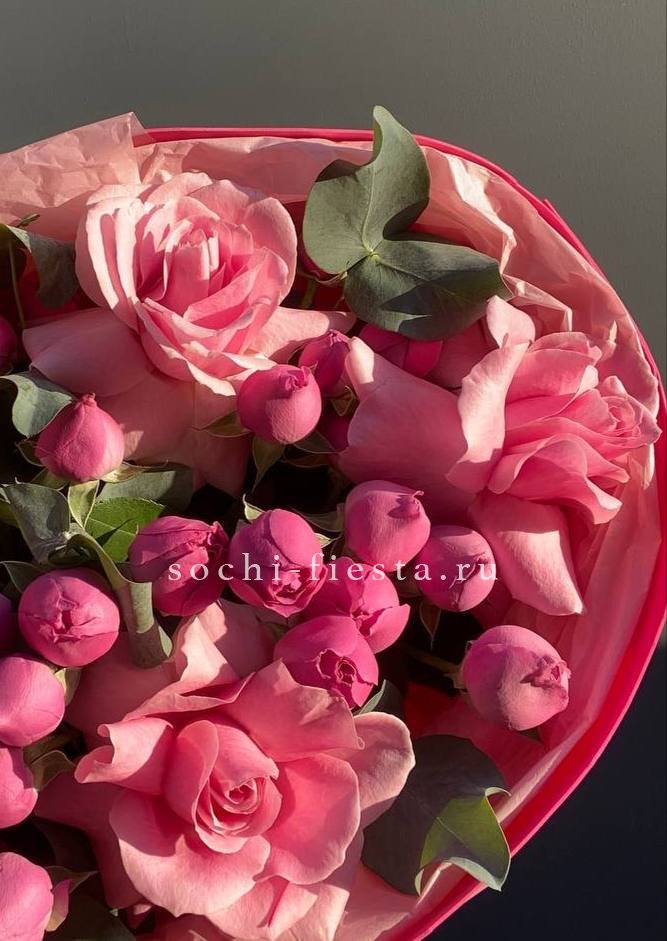 Кустовые розы и эустомы собраны в компактную форму с мягкими линиями. Сочетание нескольких оттенков создаёт живописный эффект без лишней пышности.