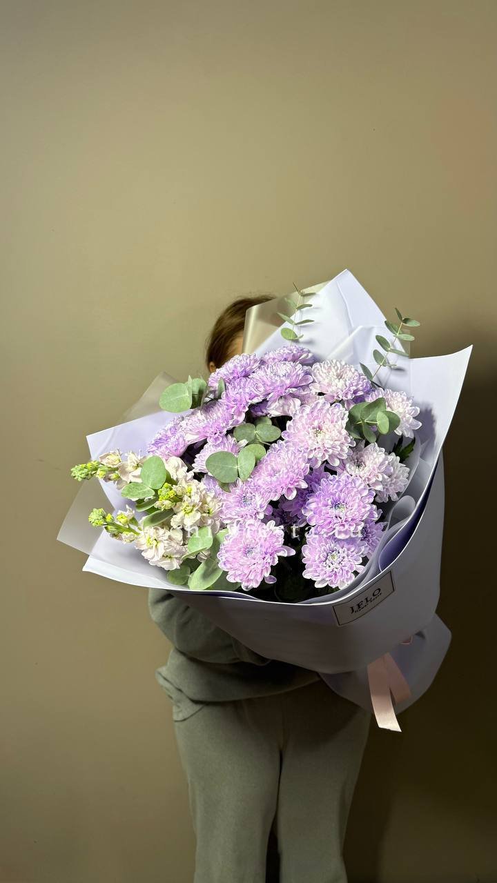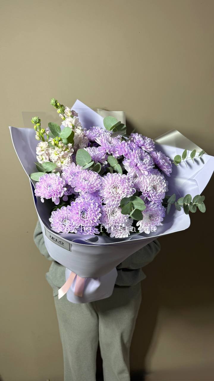 Хризантемы и розы переплетаются с диантусом и озотамнусом в букете насыщенных красок. Каждый цветок раскрывается по-своему, наполняя композицию движением и жизнью.