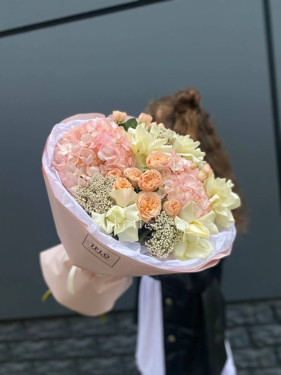 Гортензия обволакивает пионовидные и классические розы мягким облаком. Озотамус добавляет воздушности, создавая объёмную композицию с природной непринуждённостью.