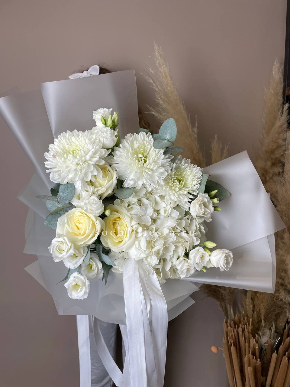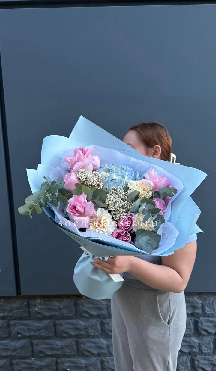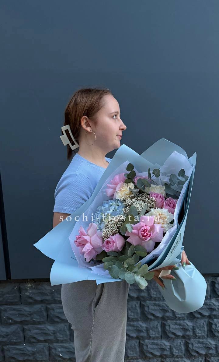 гортензия, пионовидная кустовая роза Мисти Баблс, лента, дизайнерская упаковка.