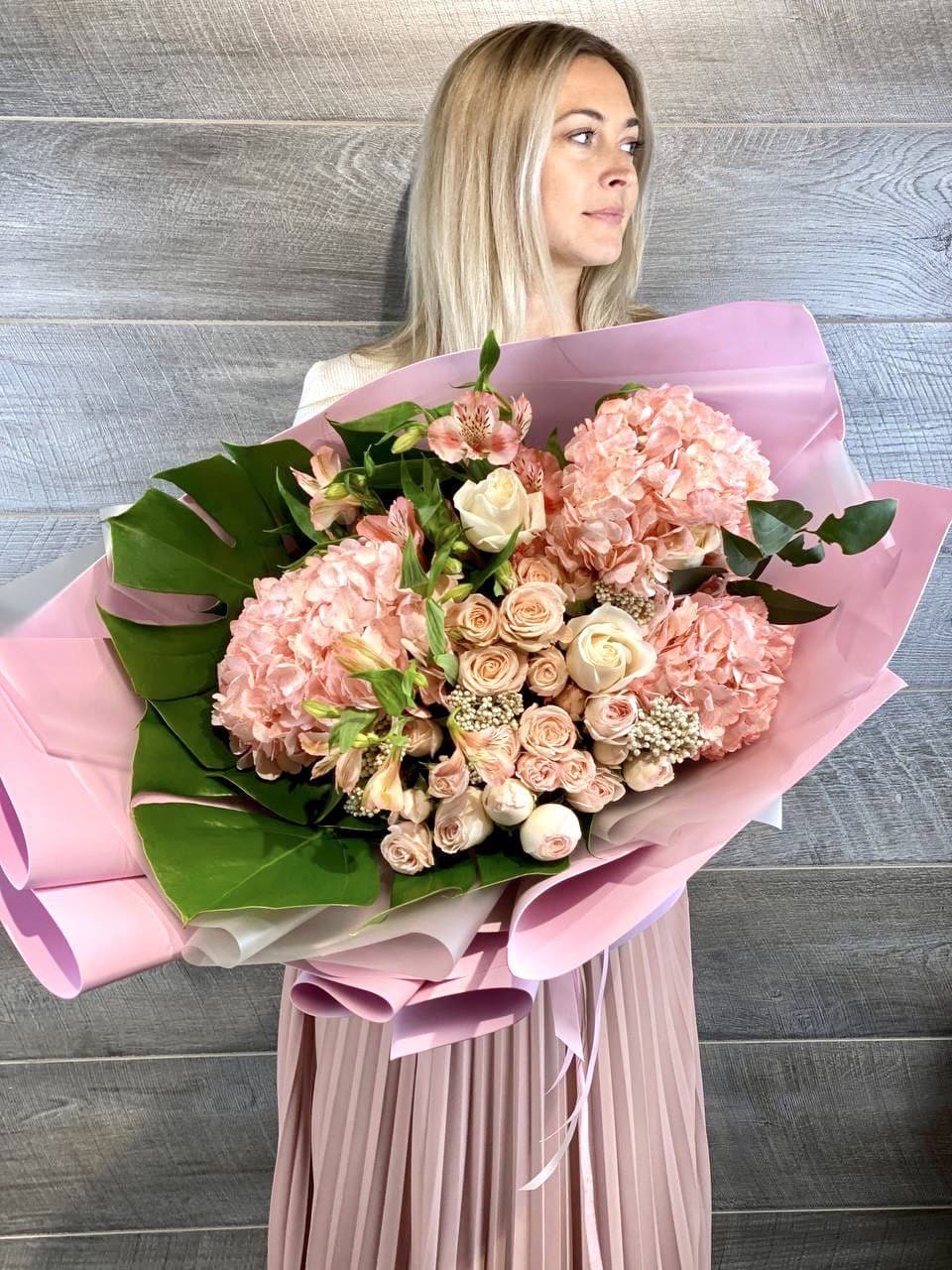 гортензия, розы, пионовидные кустовые розы, эутстома, листья монстеры (или стрелиции), озотамнус, декоративная зелень, дизайнерское оформление.