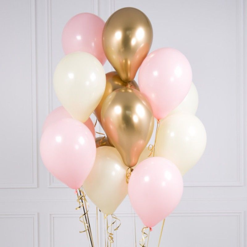 3 шт. фольгированных шара сердце розовое золото (без надписи), 3 шт. латексных нежно-розовых шара, 3 шт. хромированных золотых шаров, 2 шт. хромированных розовых шаров, грузик. Все шары мы предварительно обрабатываем специальным составом Highfloat, обеспечивая им длительный срок полета.