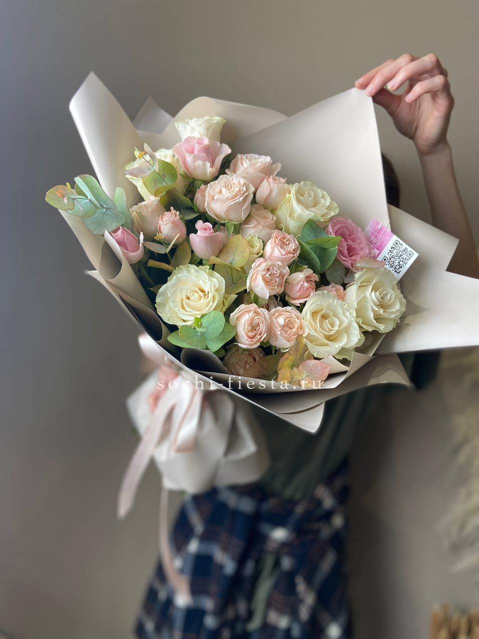 розовая и белая розы, пионовидная роза, кустовые розы, эвкалипт, лента, сумка.