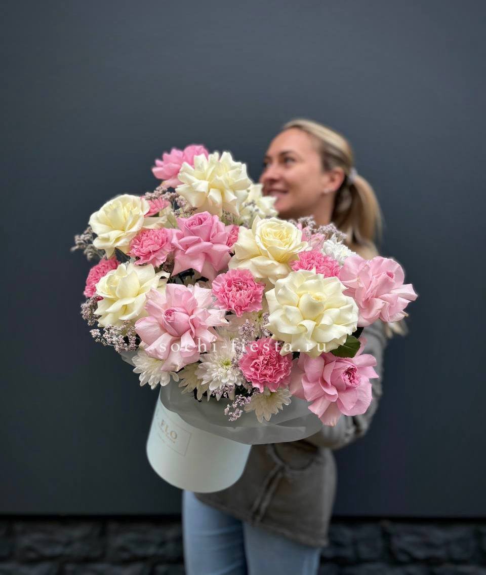 Для заказа товара "Коробка французских роз и диантусов "Бони"" с доставкой в Новосибирске нажмите в корзину