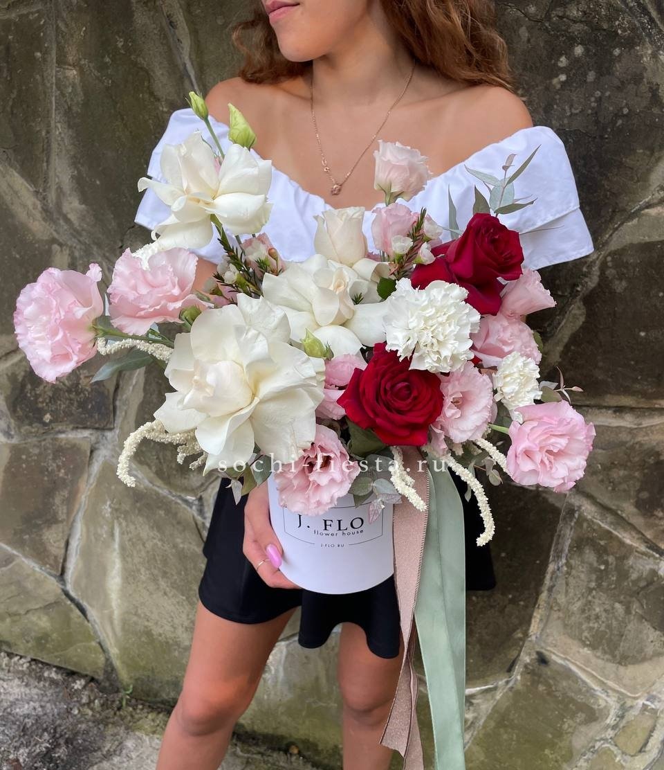 Компактная композиция в круглой коробке собрана из пышных бутонов и воздушной зелени. Roses сочетаются с многолепестковой эустомой и яркими диантусами, создавая объёмную текстуру. Подойдёт для небольших пространств и камерных поводов.