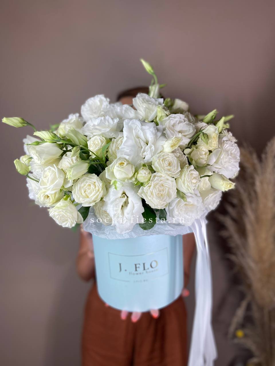 Композиция в деревянном ящике сочетает воздушную эустому с плотными головками роз и мелкими соцветиями диантуса. Фисташковый эвкалипт создает мягкую зеленую рамку вокруг цветочного наполнения.