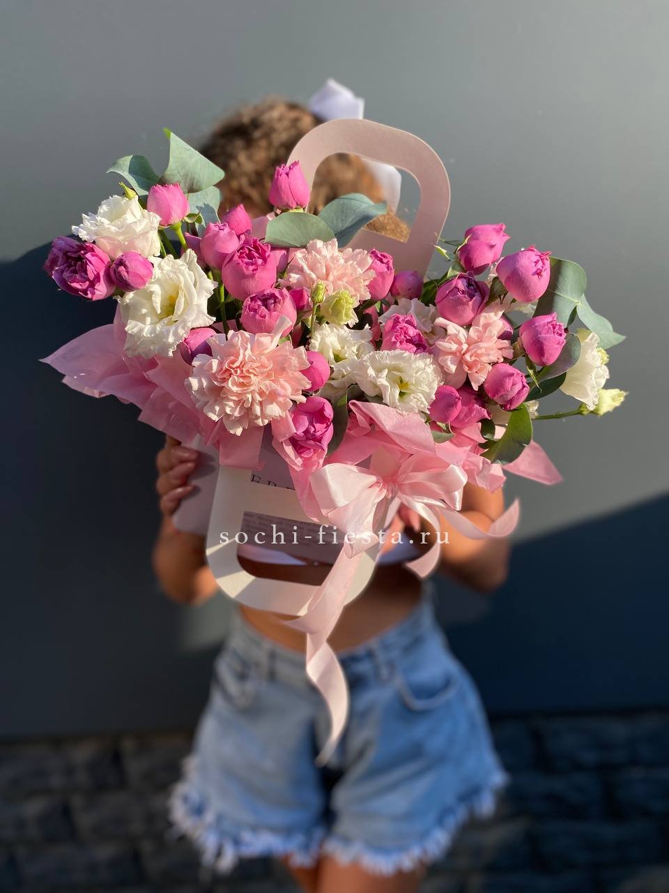 эустома, диантус, роза, кустовая роза, эвкалипт(фисташка), деревянный ящик, лента.