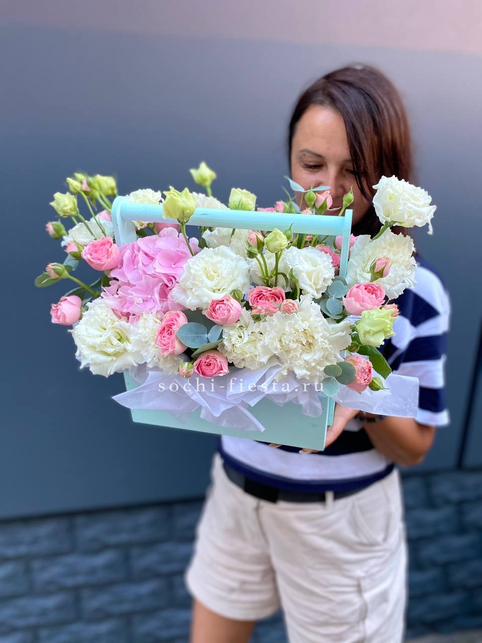 эустома, кустовая роза, фисташка, гортензия, деревянный ящик.