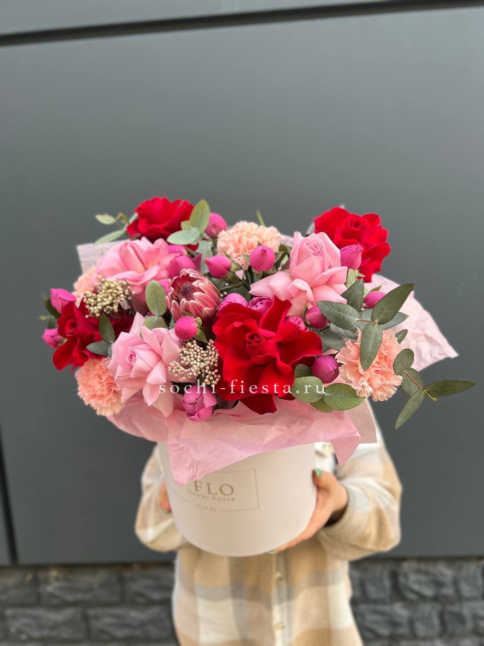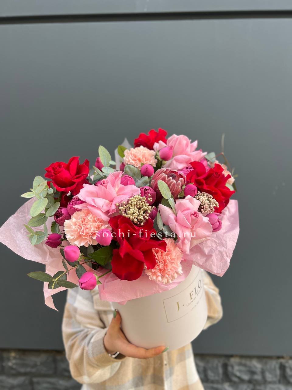Протея задаёт графику всей композиции, а розы и диантусы заполняют объём плавными переходами оттенков. Мисти баблс добавляет воздушности, озотамнус создаёт текстурные акценты между крупными бутонами.
