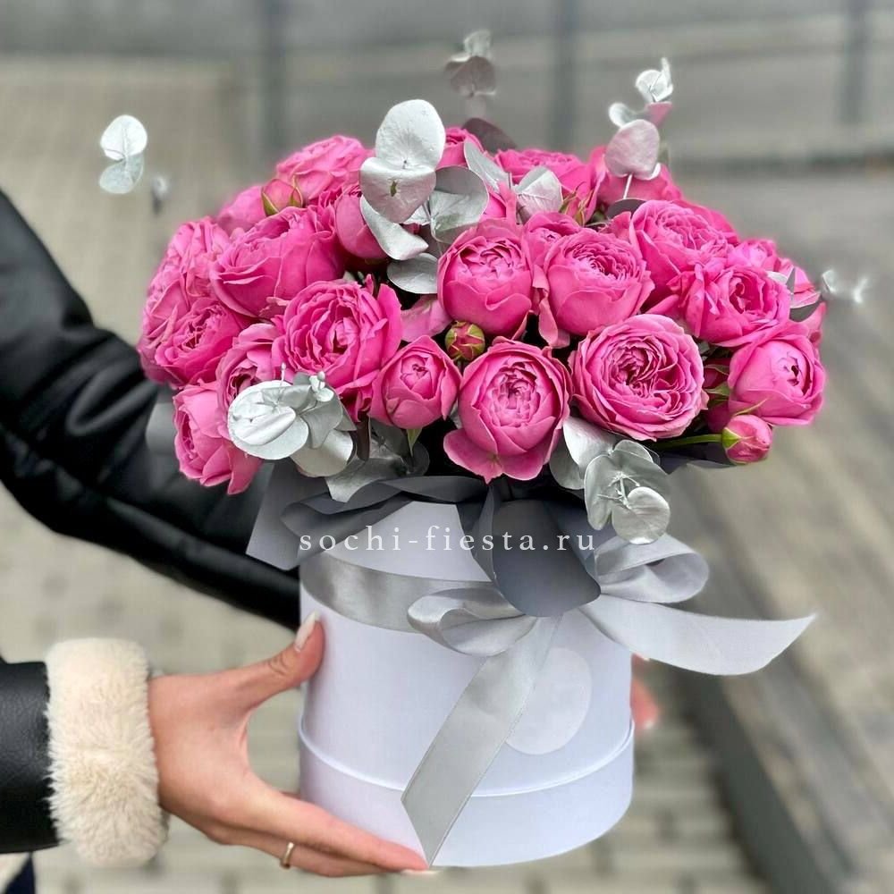 французские розы, кустовые розы, диантусы, матиолла, лагурус, цилиндр D20,  бумага тишью.
