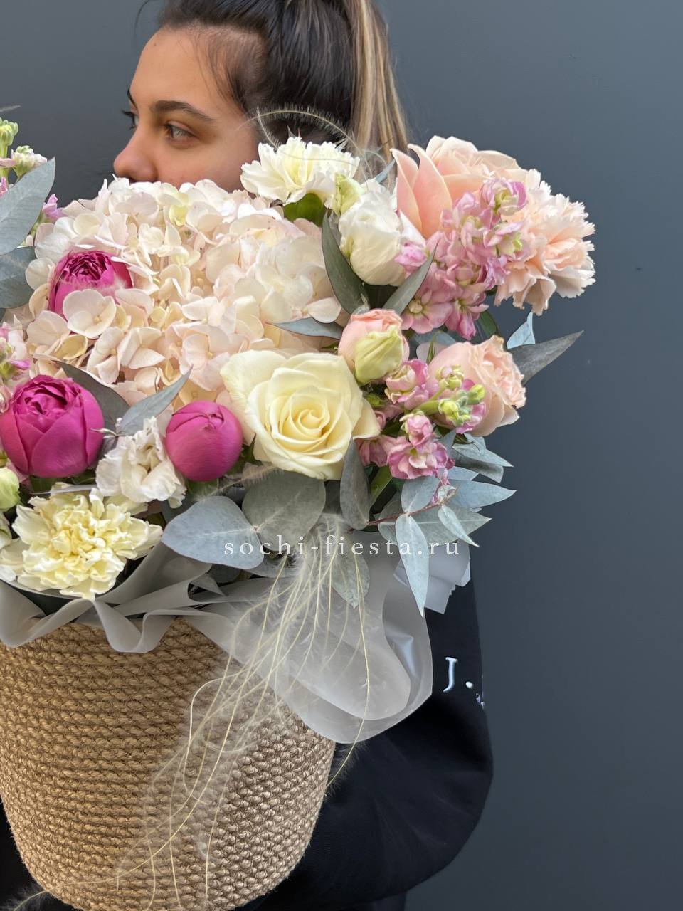пионовидные розы Мисти Бабблс, гортензия, розы, диантусы, эустома, маттиола, джутовое кашпо, стифа, эвкалипт.
