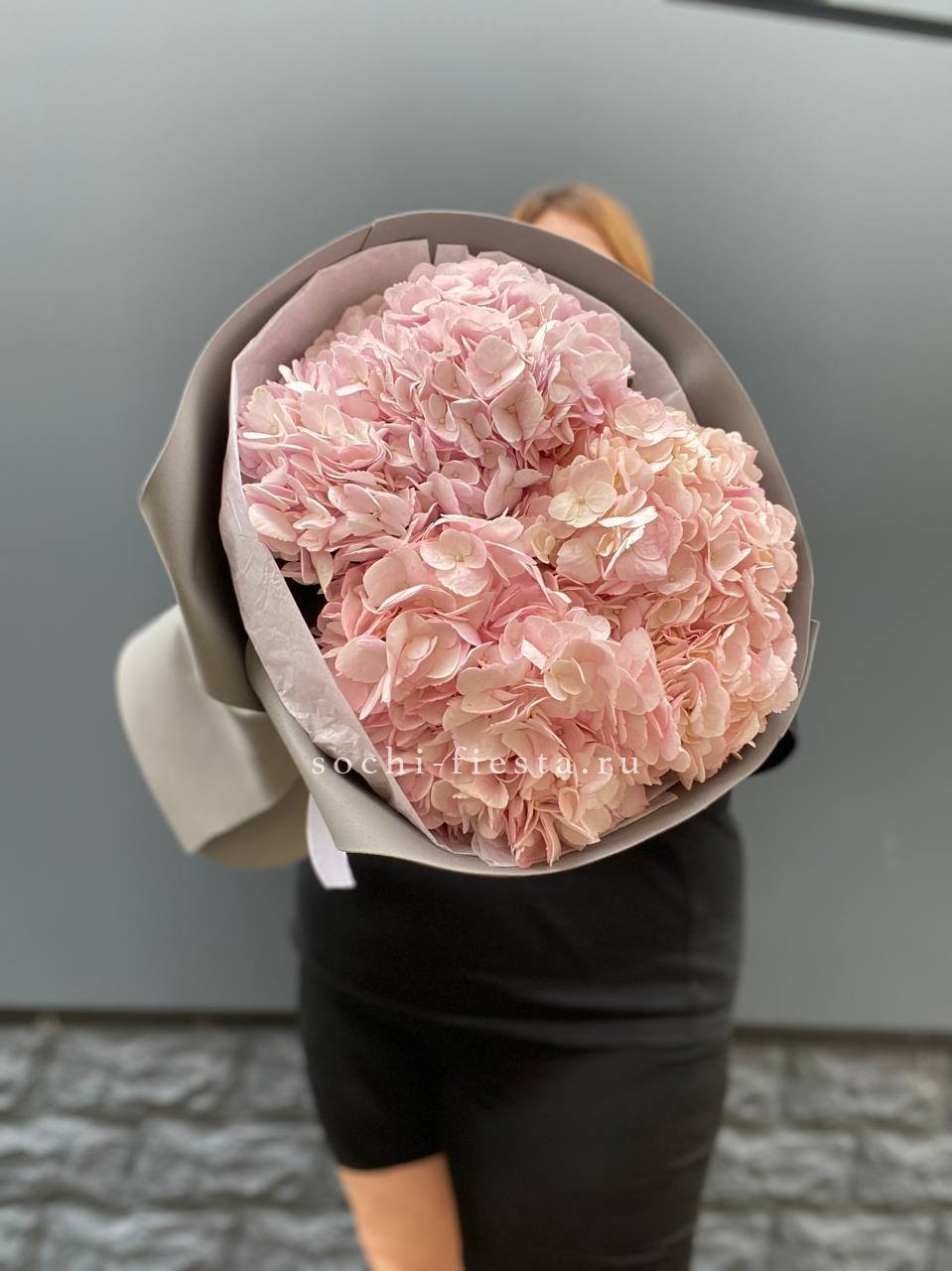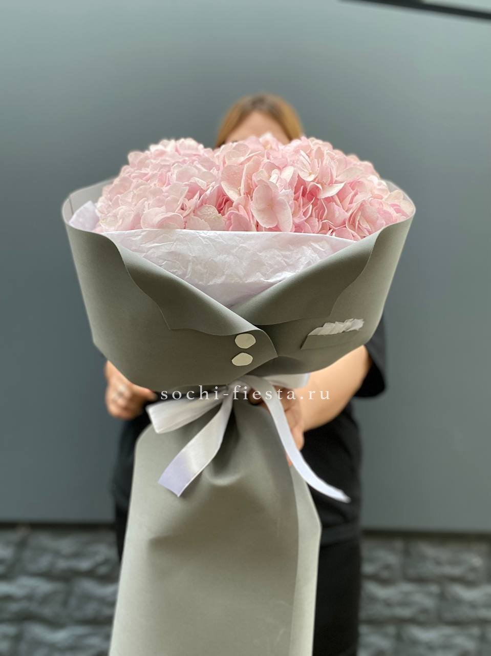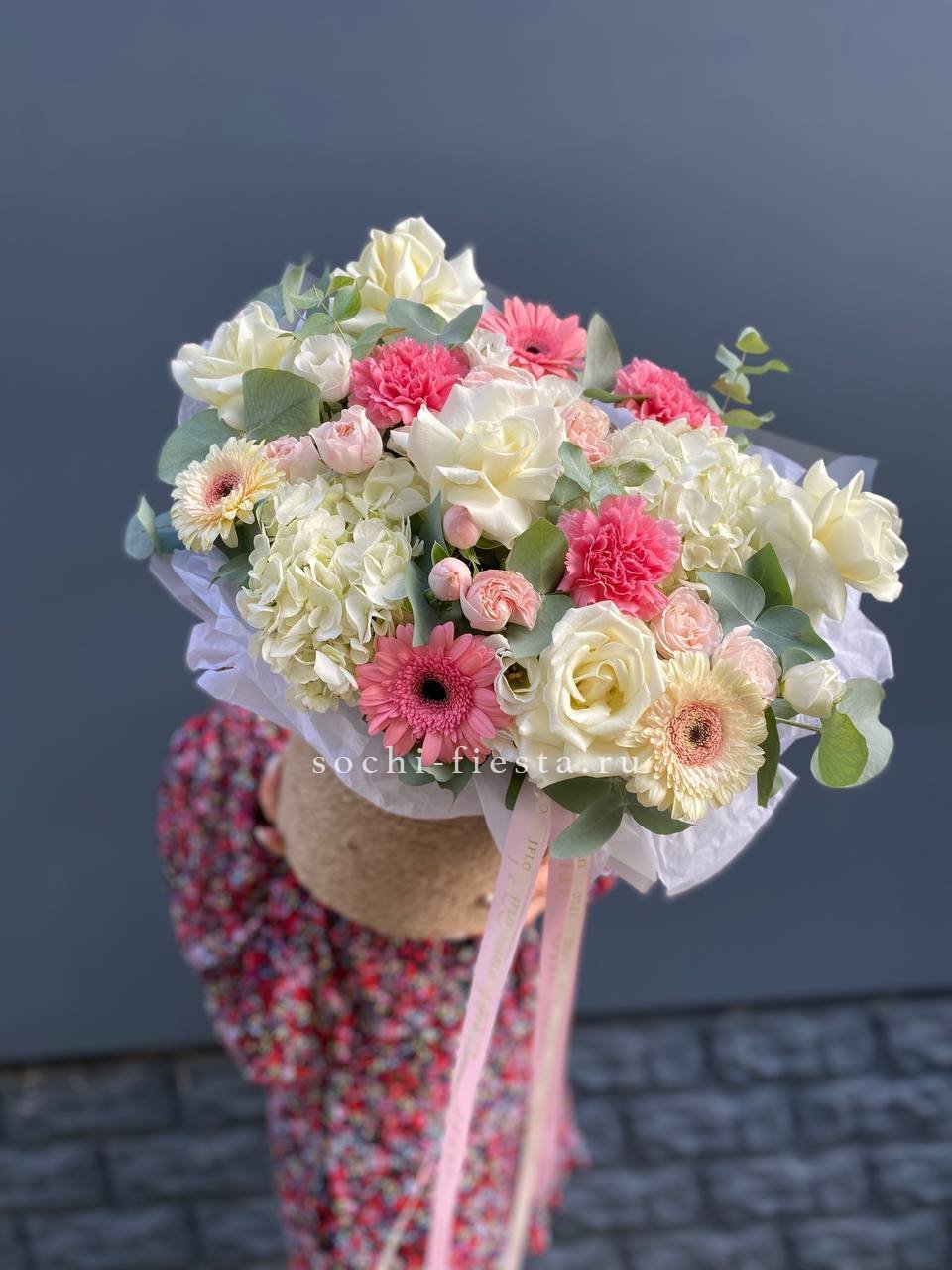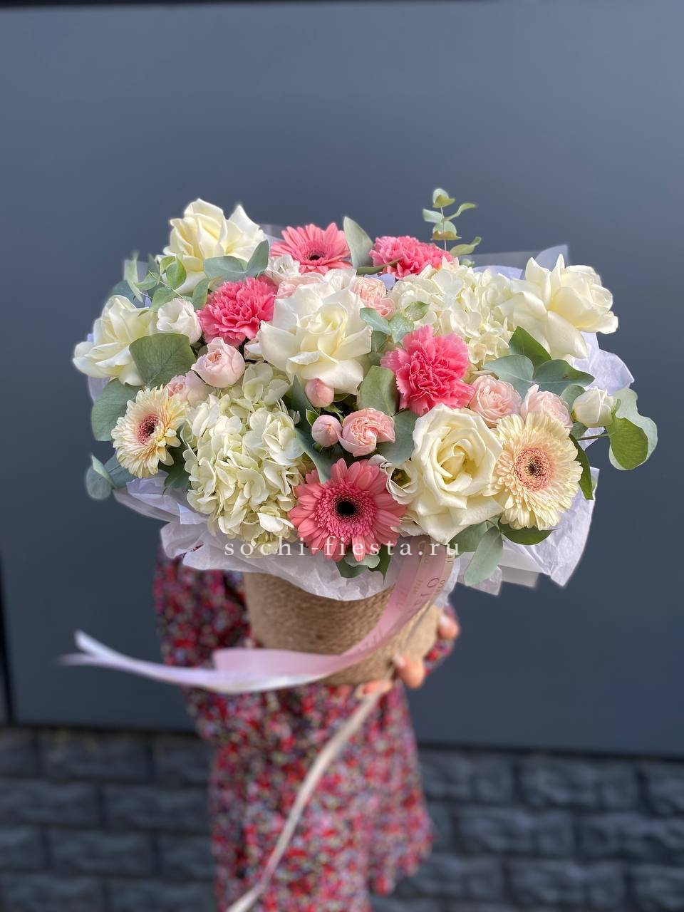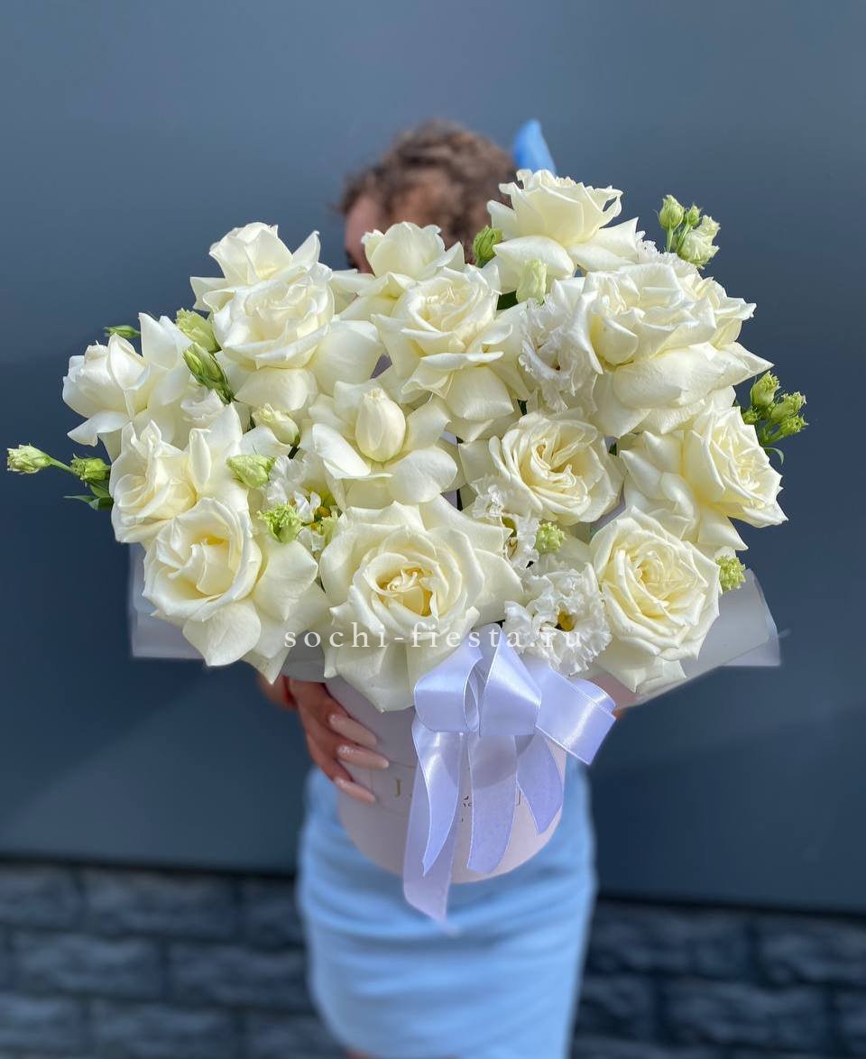 Белоснежные розы и воздушная гортензия создают объёмную композицию с мягкими переходами оттенков. Эустома и диантус добавляют фактурности, а лимониум заполняет пространство между крупными бутонами.