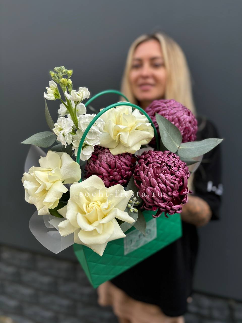 хризантемы бигуди, маттиола, розы,  эвкалипт, сумка.
