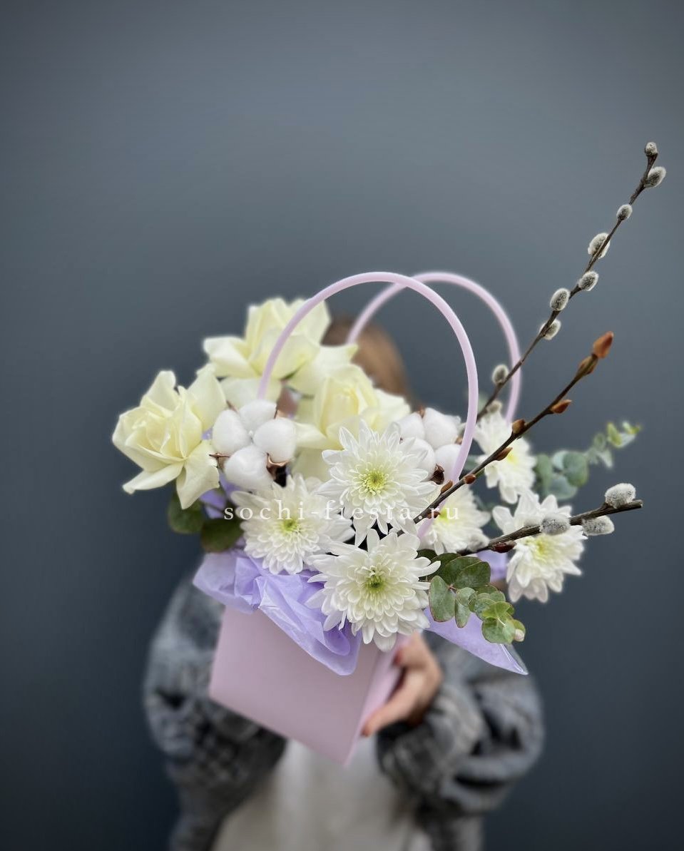 Розовые розы и диантусы переплетаются с кустовыми хризантемами в плотной округлой композиции. Альстромерия добавляет графичные акценты между бутонами. Сумочка собирает все элементы в аккуратную форму с естественным объёмом.