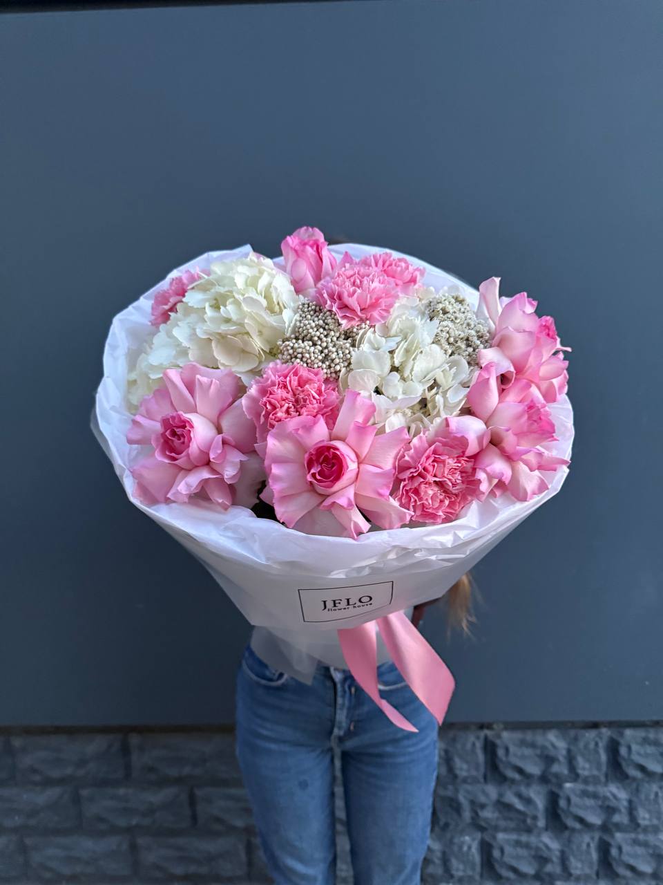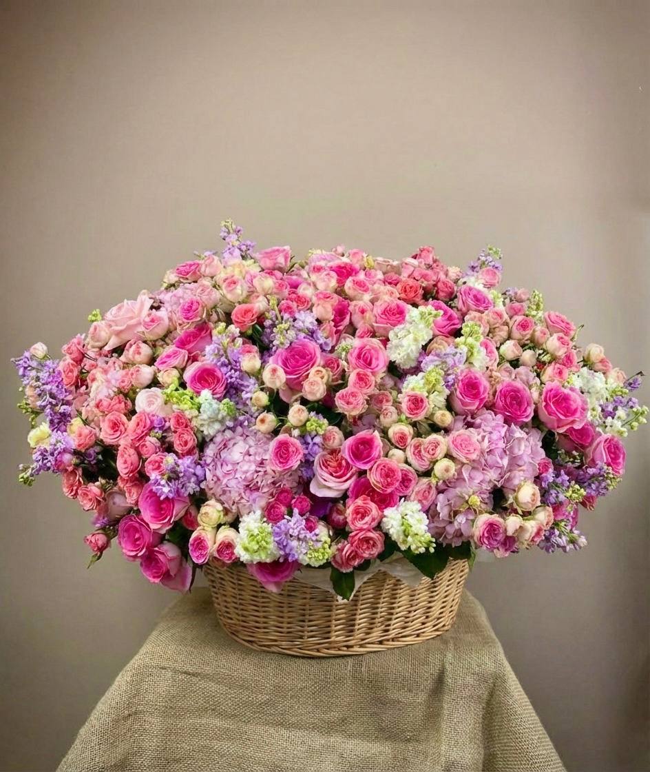 гортензия, диантус, розовая роза, эустома, гербера, корзина средняя, наполнение.