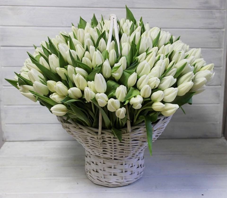 151 белый тюльпан, светлая корзина.