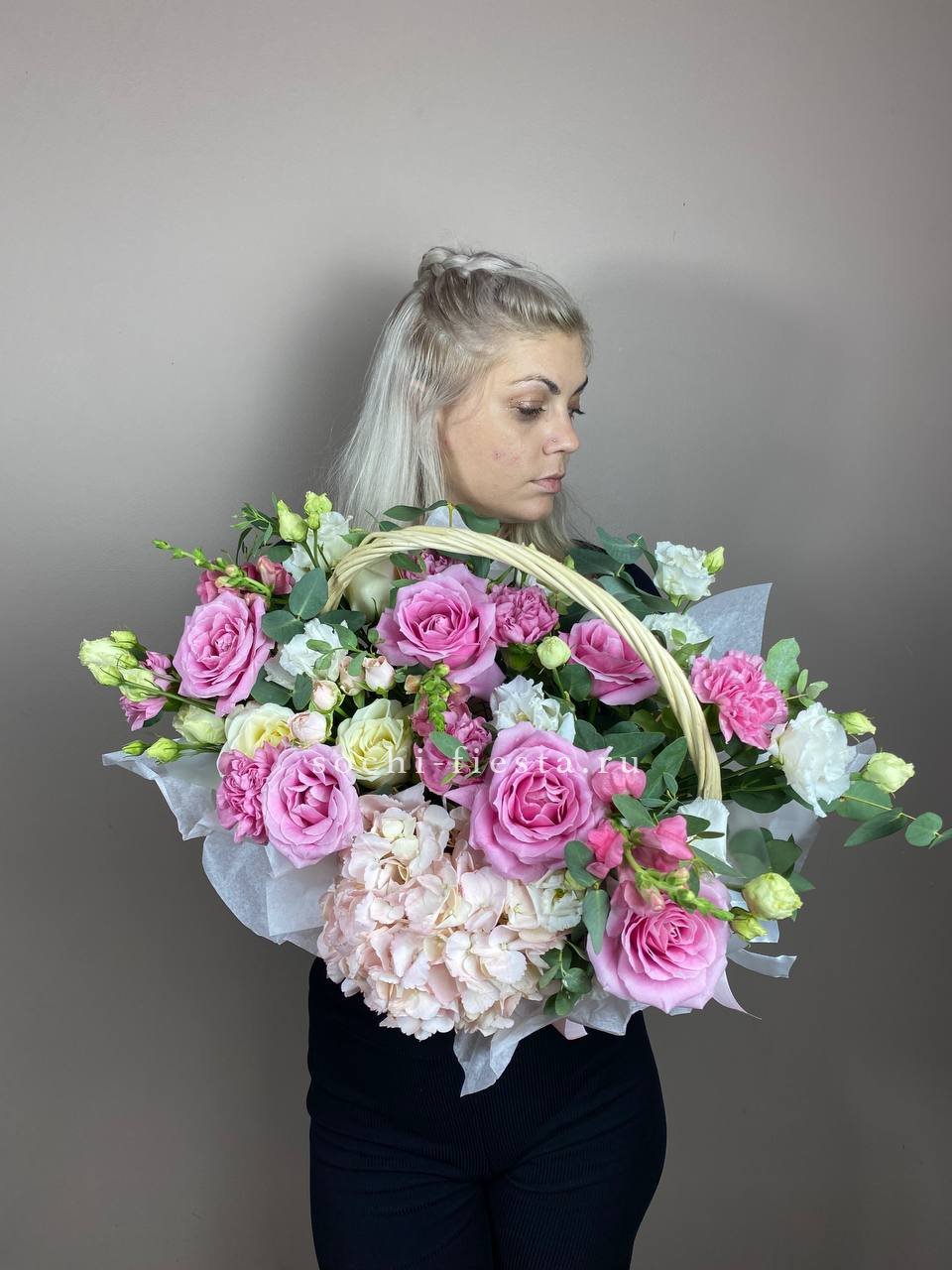цветочная корзина с розами, мисти баблс, диантусами и гортензией.