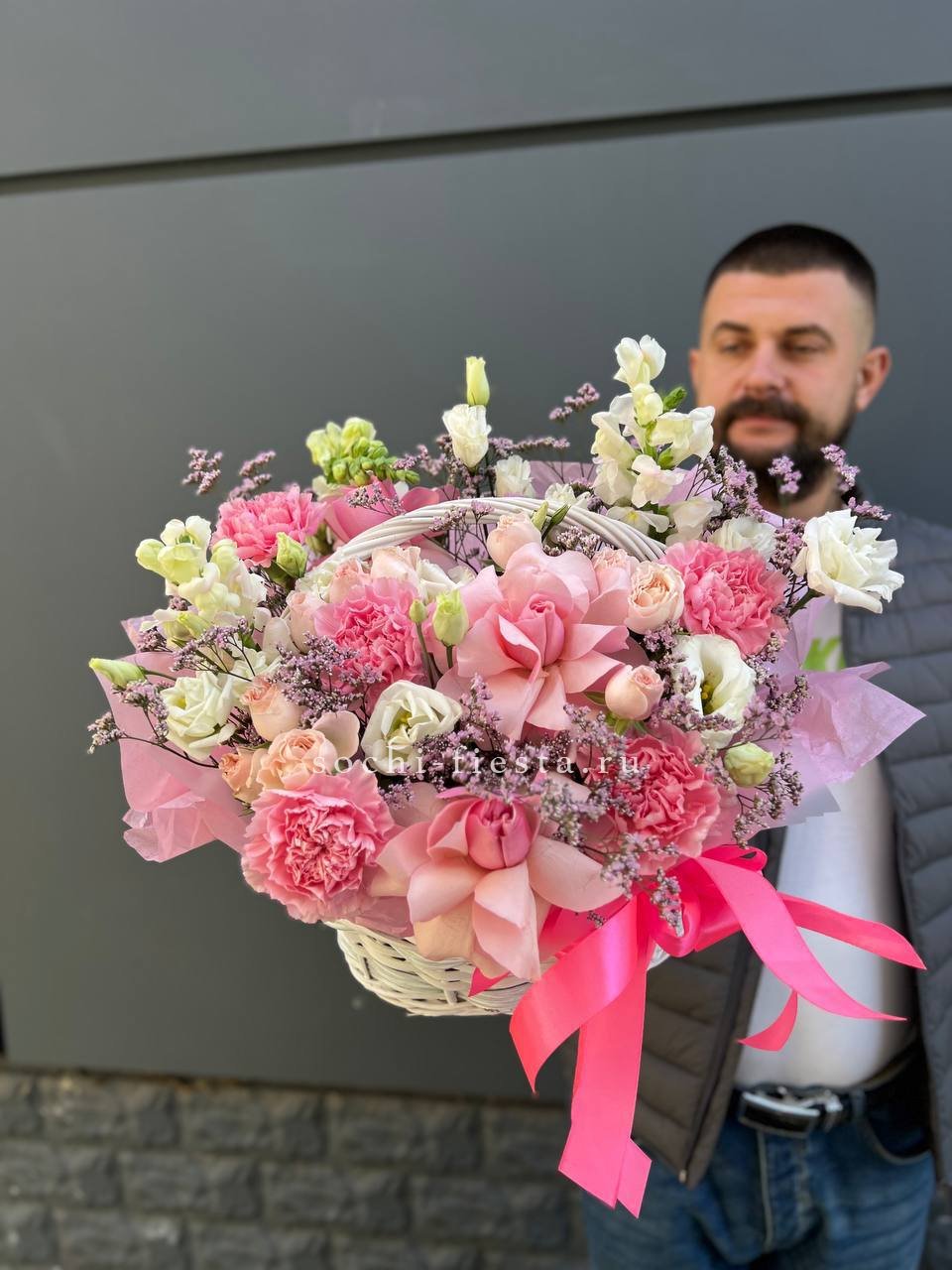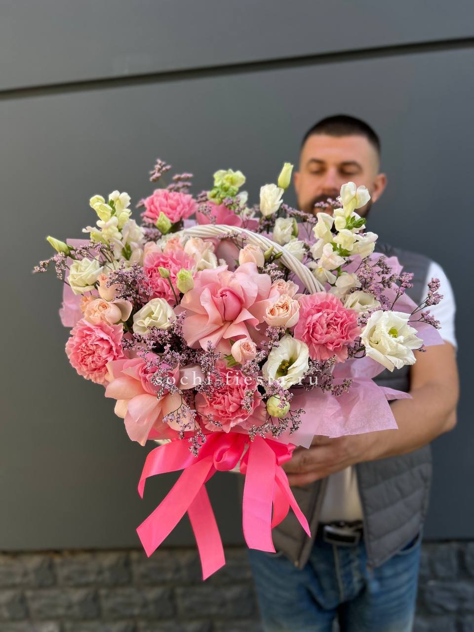 Плотная россыпь кустовых роз и эустомы создает живую текстуру с множеством мелких бутонов. Диантус добавляет воздушности, а эвкалипт собирает композицию в завершенную форму. Корзина позволяет разместить букет на столе без дополнительной вазы.