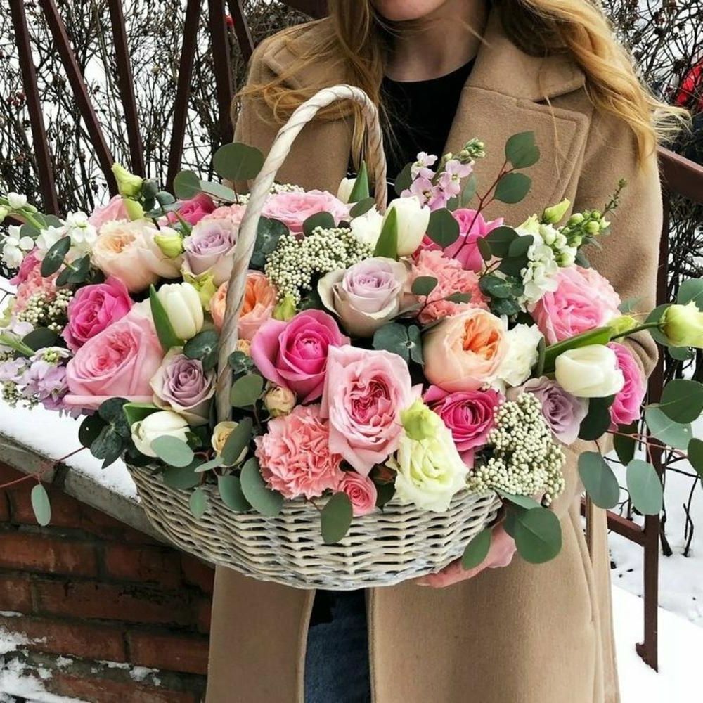 розы нежных оттенков (по возможности джумилия),эустома, диантусы,  гербера, альстромерии,  лента, корзина