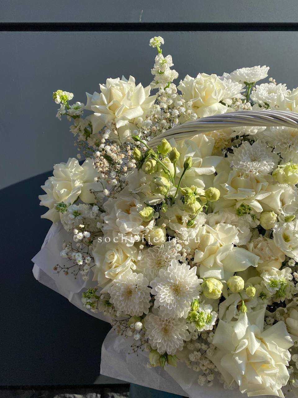 розы, кустовые розы, гортензия, маттиола (или аналог вне сезона), эустома, эвкалипт, лента, дизайнерская упаковка.