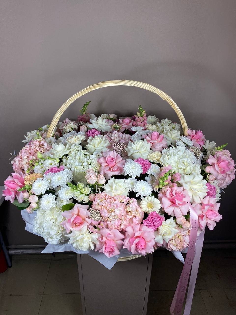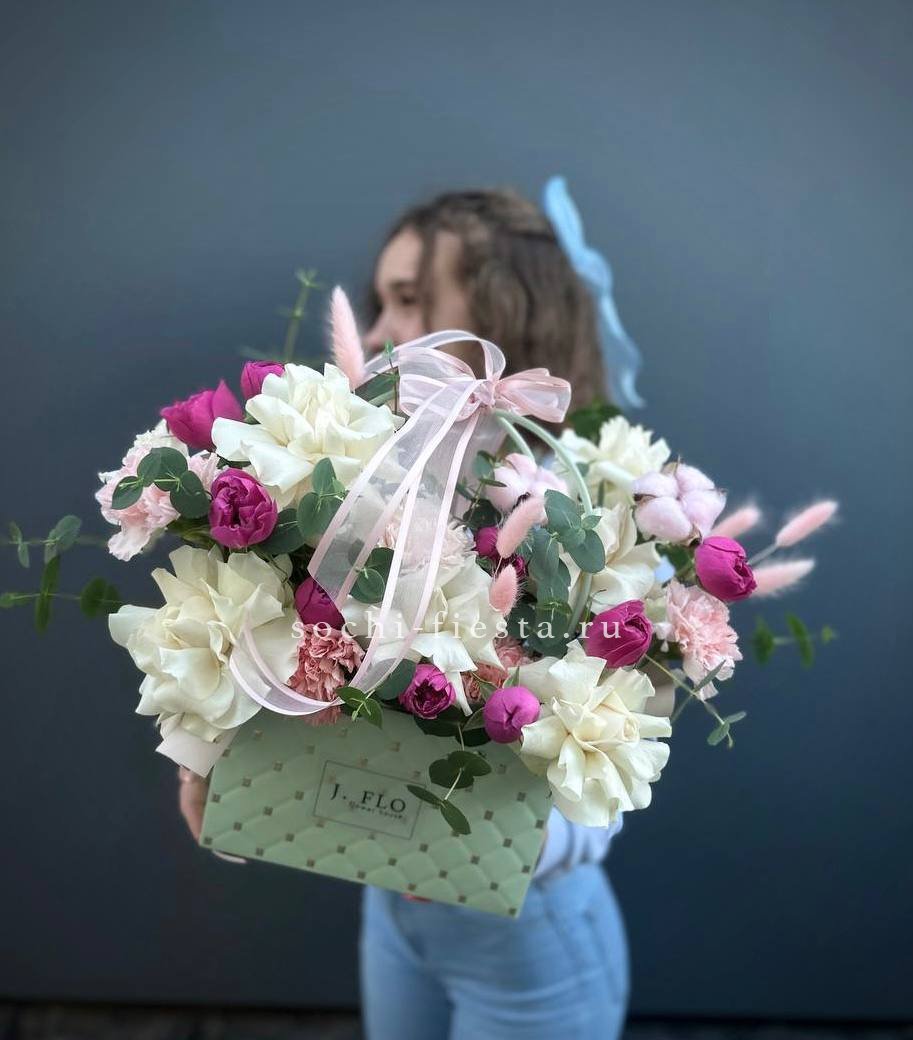Пятьдесят один бутон Мисти Баблс собраны в плетёную корзину и образуют плотную цветущую полусферу. Лавандовые оттенки раскрываются постепенно и держат форму долго.