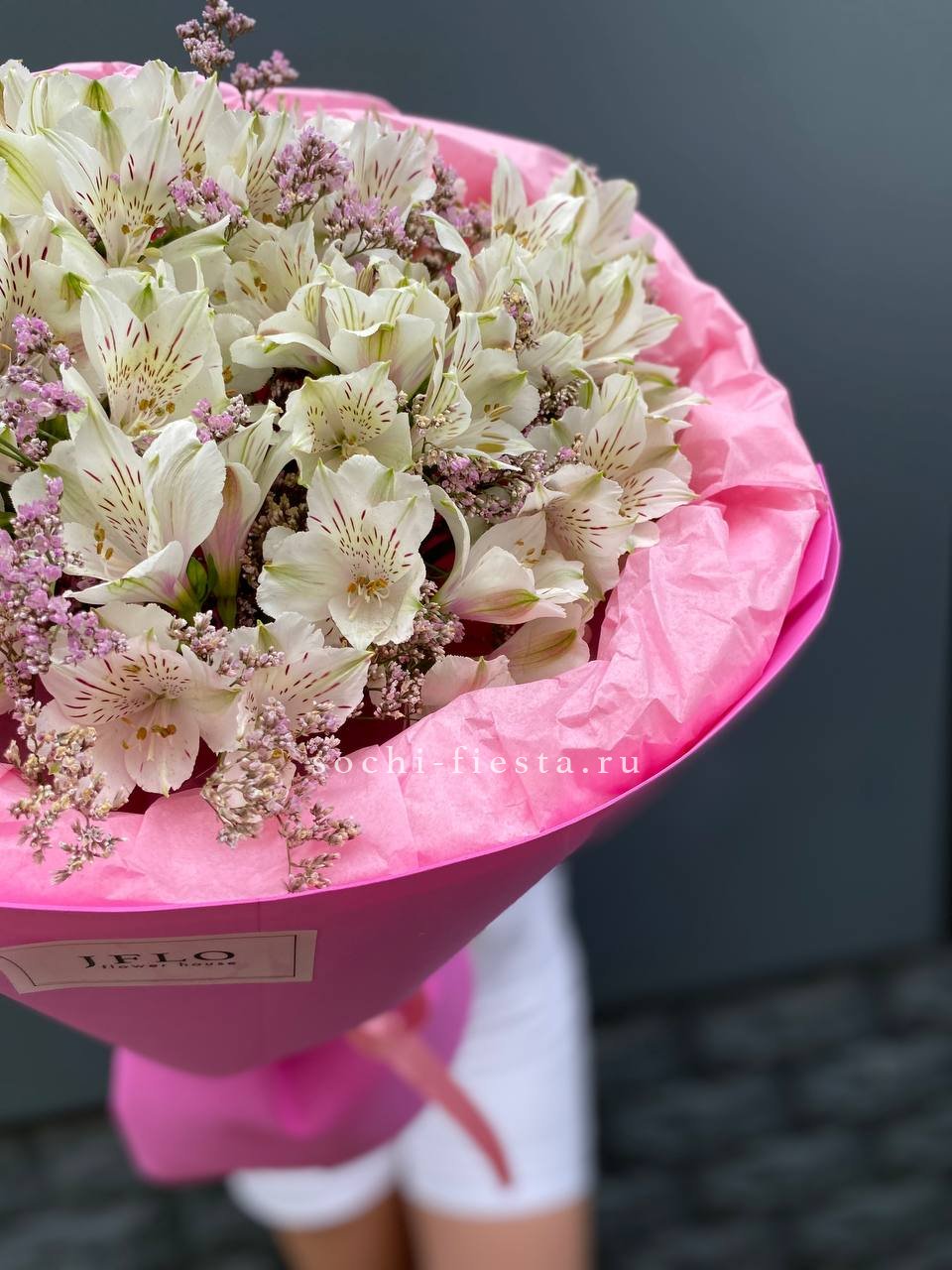 Одиннадцать белых альстромерий собраны в плотный букет с воздушным лимониумом. Светлая гамма и простая форма легко вписываются в любой интерьер. Универсальное решение для дома или в подарок близким.